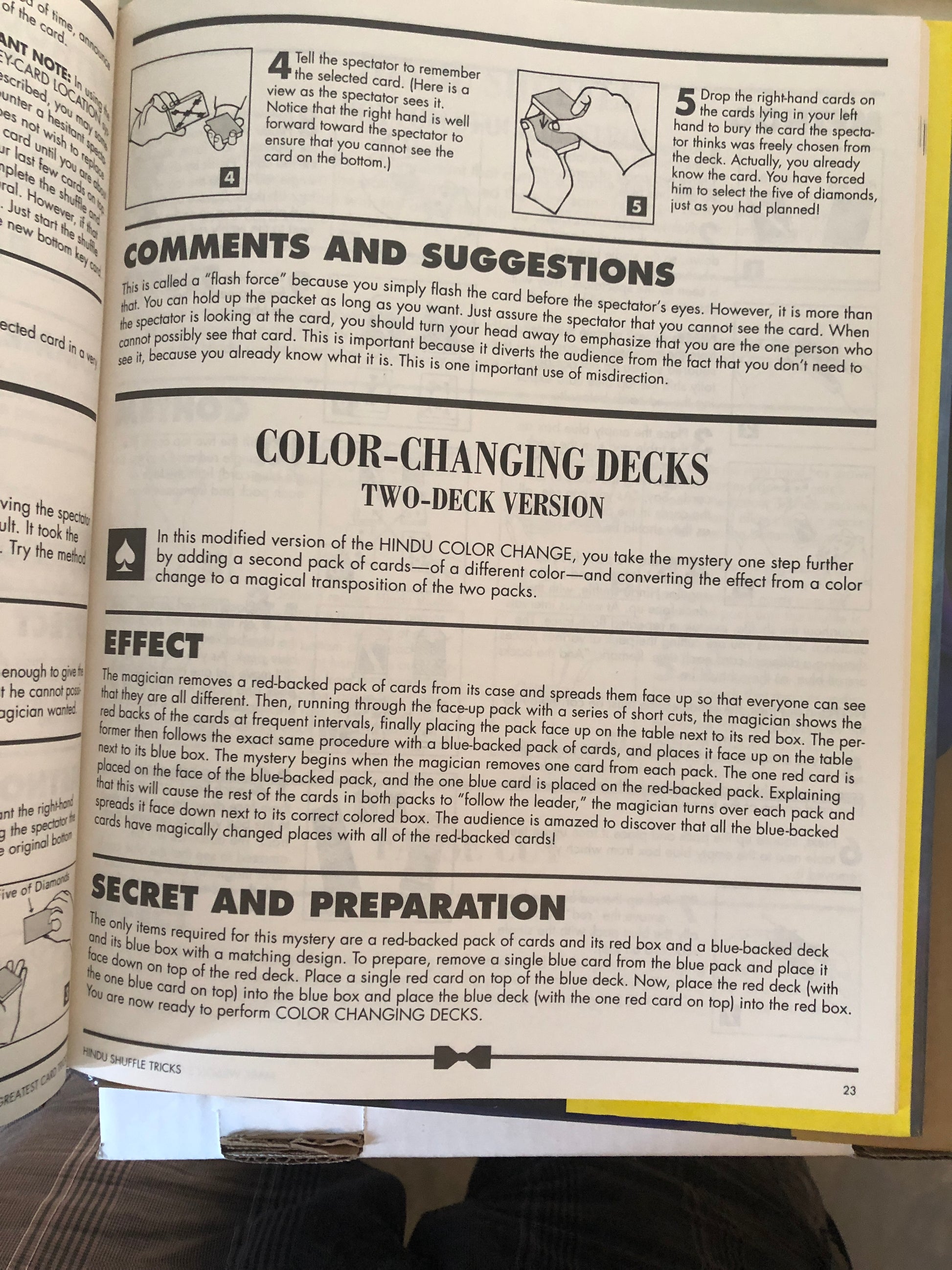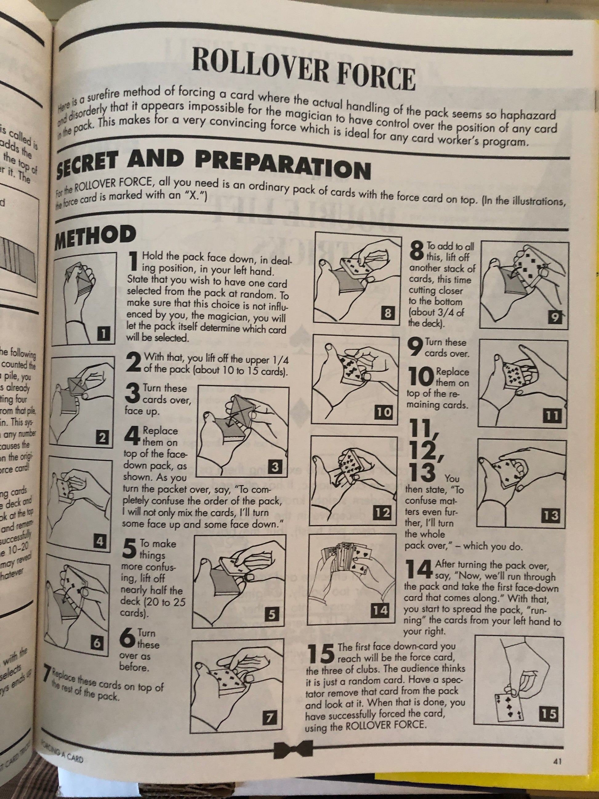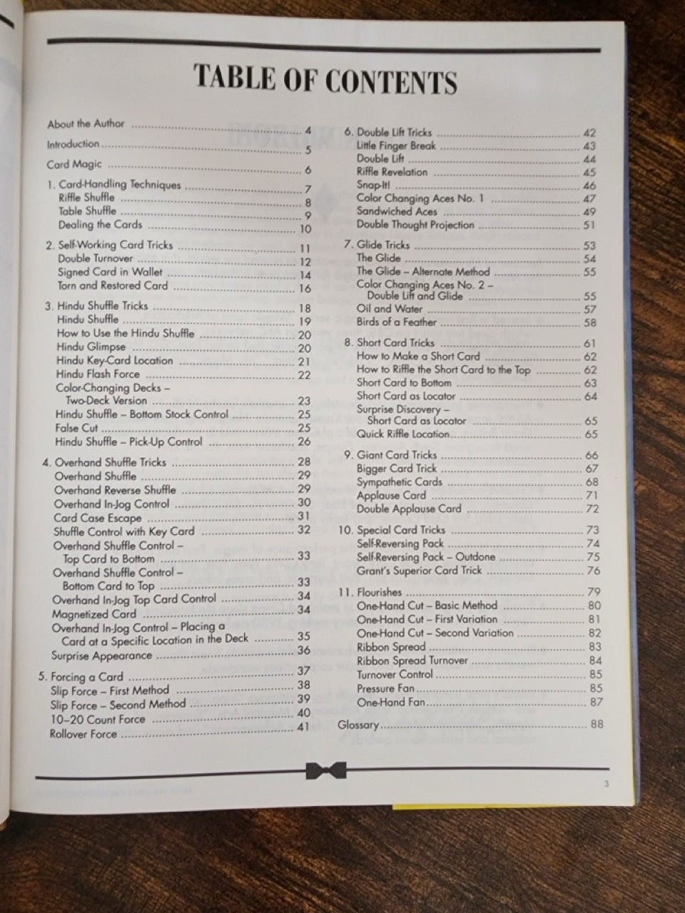 Card Handling Techniques, Self-working card tricks, Hindu Shuffle tricks, Overhand shuffle tricks, Forcing a card, Double Lift tricks, Glide tricks, Short Card Tricks, Giant Card Tricks, Special Card Tricks, Flourishes and a Glossary in the back.