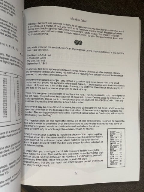 But to give you an idea of the vastness of the material in this tome, there are over FIFTY pieces in these pages that use anywhere from one to six dice (more, in one more case), and NOTHING ELSE. This means that if you've got a couple of dice in your pocket or case, you could conceivably have material for an entire set using just the dice and nothing else. And it would all be killer mentalism.