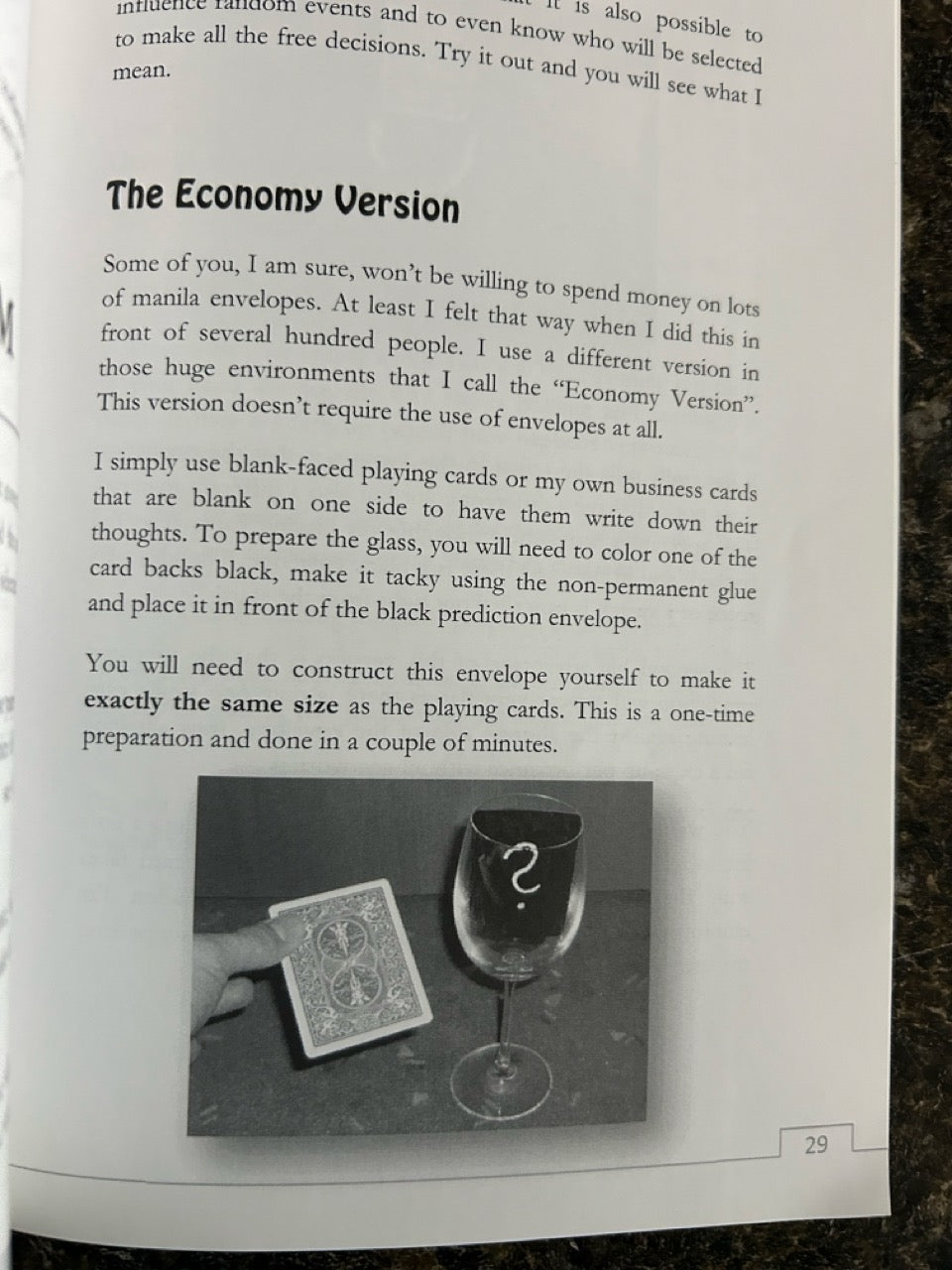 A clear wine-glass is seen on a table center-stage, containing a black envelope with a prediction. The spectators are asked to concentrate on a single thought, write it down on a card and seal it in an opaque envelope. At your command, they all throw their envelopes onto the stage. A random spectator selects any one of the envelopes (again: NO force!). Let's assume the thought inside reads "ICE CREAM". SHE removes the prediction from the glass and opens it. SHE reads the prediction aloud: it matches the freely selected thought!