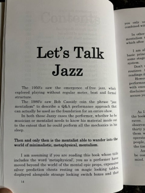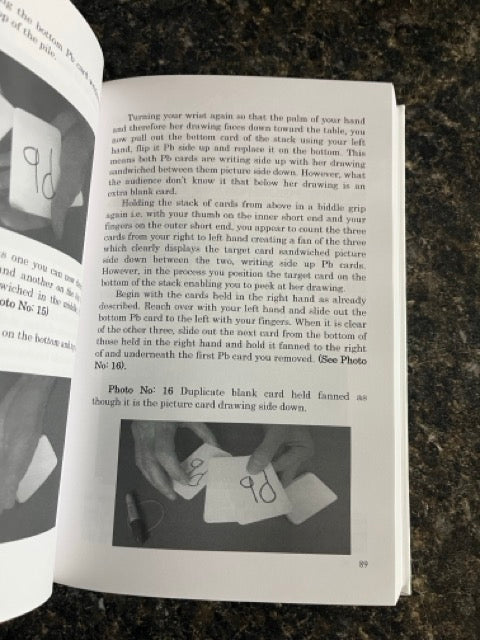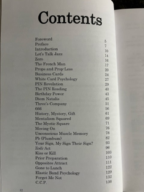 362 pages, 20 essays, insights and observations, a link to a free downloadable video demonstrating multiple utility moves, 46 photographic descriptions covering 30 full mentalism and psychic entertainment routines suitable for one to one performances, close-up, table hopping, cabaret and stage, including demonstrations of mind reading, predictions, tarot reading, numerology and a full audience Question and Answer system with all the scripting, worked from your pockets using nothing more than a stack of double blank cards and a pen.