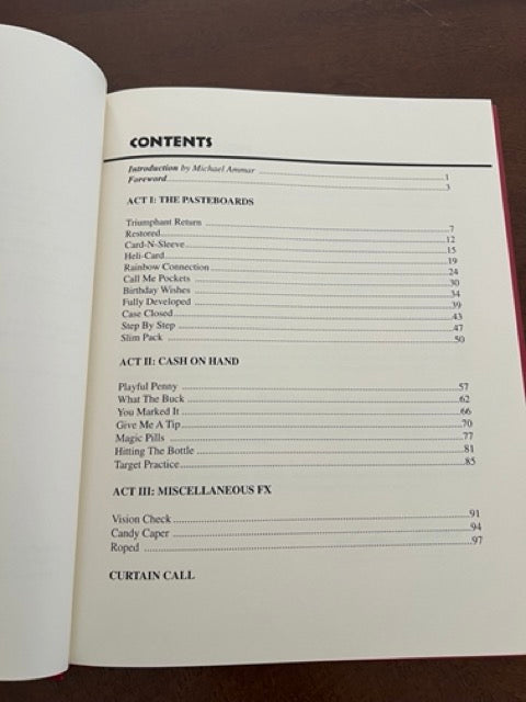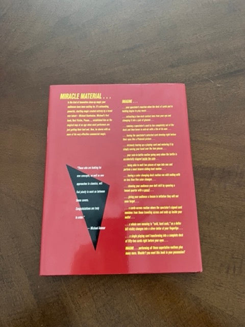 Imagine performing these: ... extracting a two-inch contact lens from your eye and changing it into a pair of glasses ... causing a spectator's card to rise completely out of the deck and then hover in mid-air with a life of its own ... having the spectator's selected card develop right before their eyes like a Polaroid picture ... viciously tearing up a playing card and restoring it by simply waving your hand over the torn pieces ... your coin-in-bottle routine going awry when the bottle is accidentally slapped inside the coin ... being able to melt two pieces of rope into one and perform a most bizarre sliding know routine ... having a color changing deck routine run wild ending with no less than five color changes ... showing your audience your deft skill by spearing a tossed quarter with a pencil ... a cards-across routine where the spectator's signed card vanishes from those traveling across and ends up inside your wallet ... a whole new meaning to "cold, hard cash," as a dollar bill visibly changes into a silver dollar at your fingertips ... a single playing card transforming into a complete deck of fifty-two cards right before your eyes ... IMAGINE ... performing all these superlative routines plus many more.