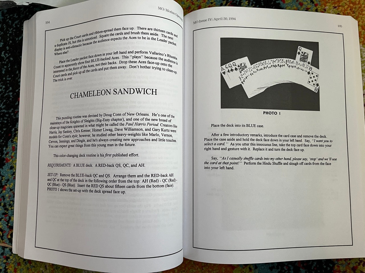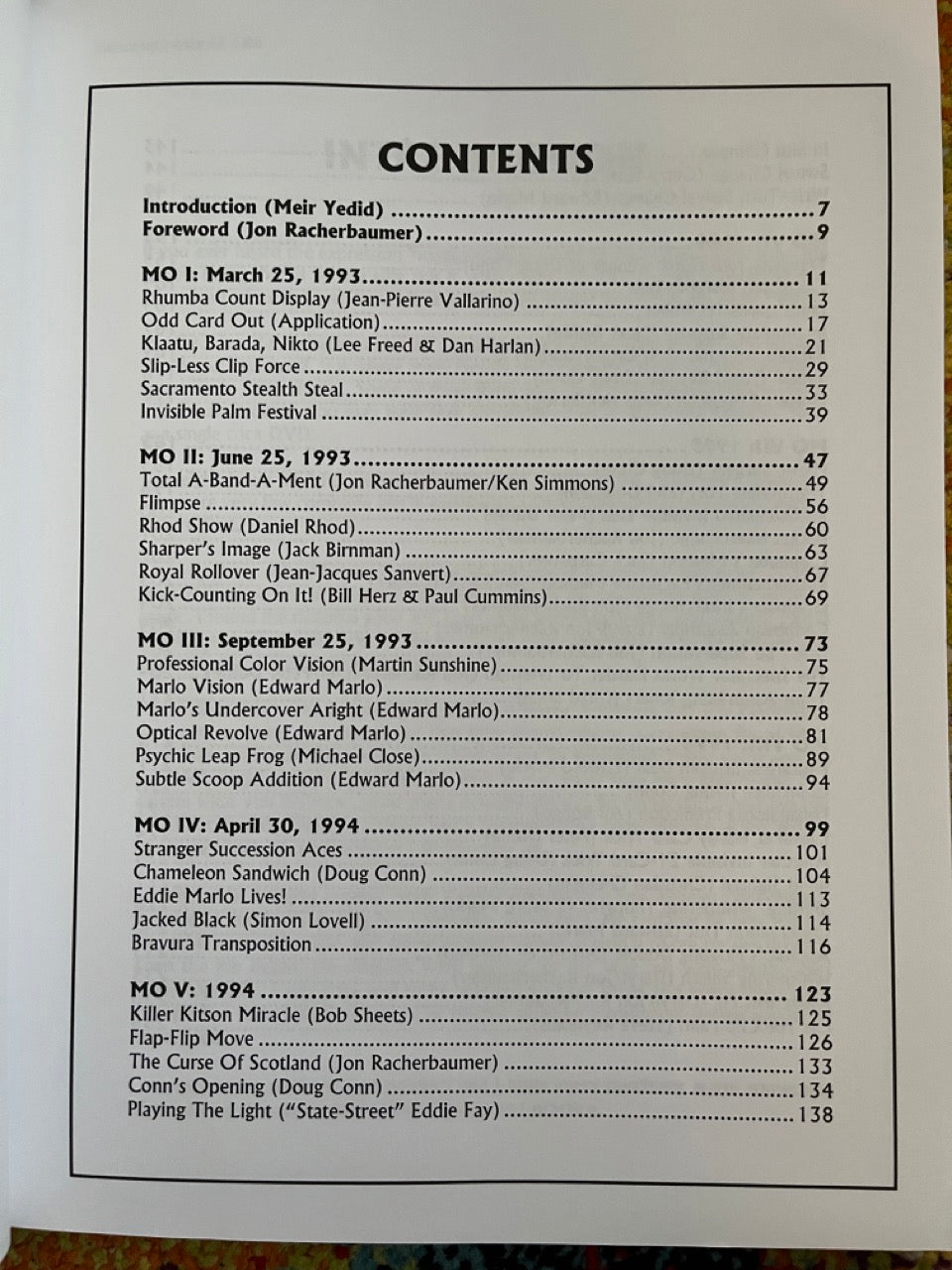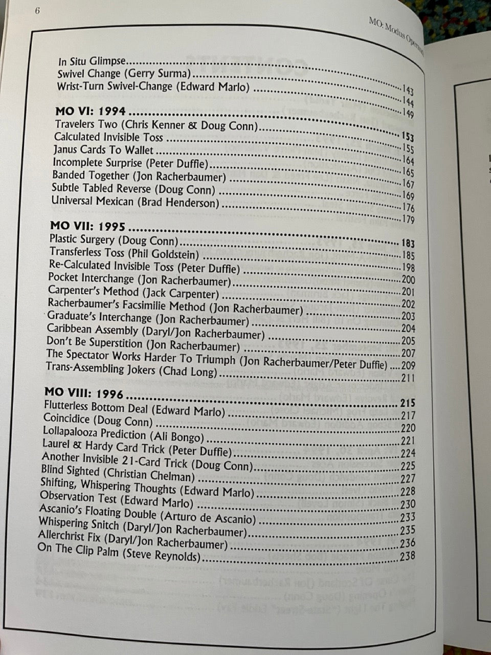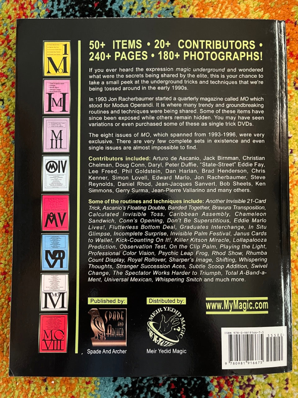 In 1993 Jon Racherbaumer started a quarterly magazine called MO which stood for Modus Operandi. It is where many trendy and groundbreaking routines and techniques were being shared. Some of these items have since been exposed while others remain hidden. You may have seen variations or even purchased some of these as single trick DVDs.