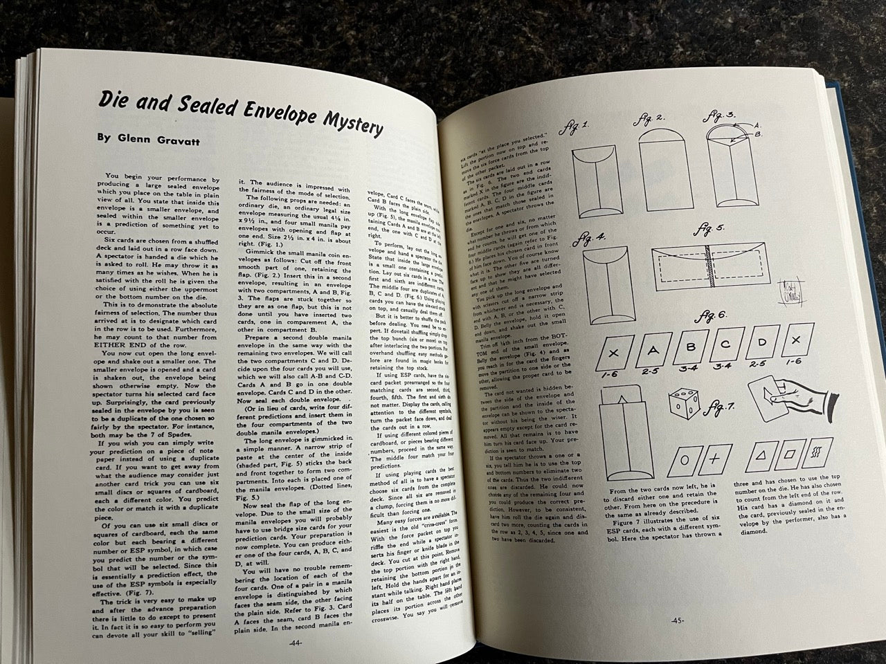 The book contains a wide variety of mentalism, coins, silks, ropes, ring and rope, cards, canes, dice, etc.