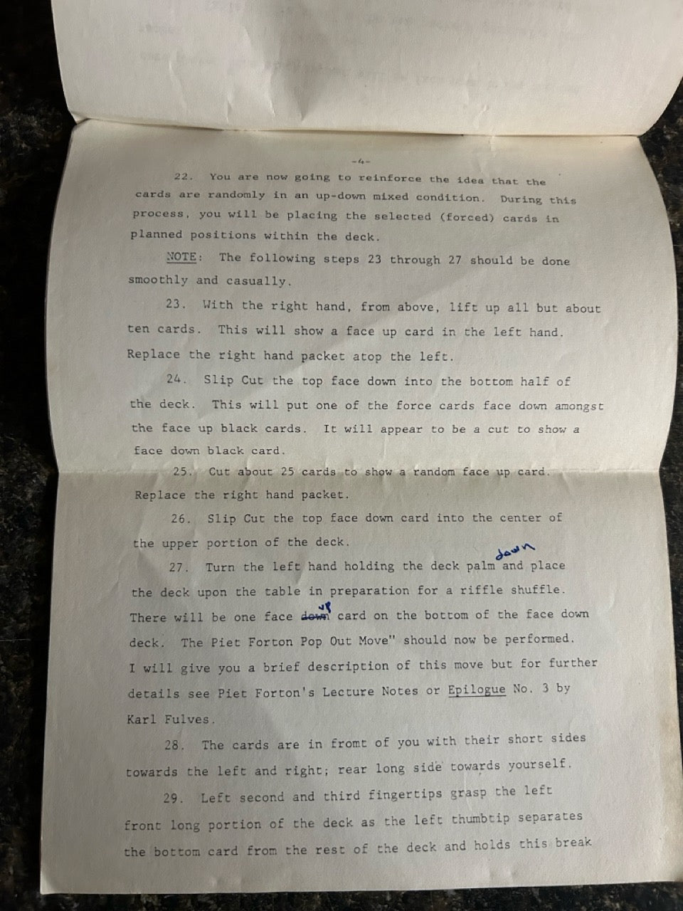 The title is self explanatory but here is the effect as it is described in the booklet: Three cards are selected from a shuffled deck and returned. The pack is then shuffled half face up, half face down. Afterwards, the cards are shown to be in a randomly mixed condition. The magician now cuts the deck into two portions and with a magical gesture, one of the selected cards jumps out from between those two packets. Each half is then ribbon spread to show a selected card face up in the center of each face down half. The halves are now turned face up to reveal a startling color separation.