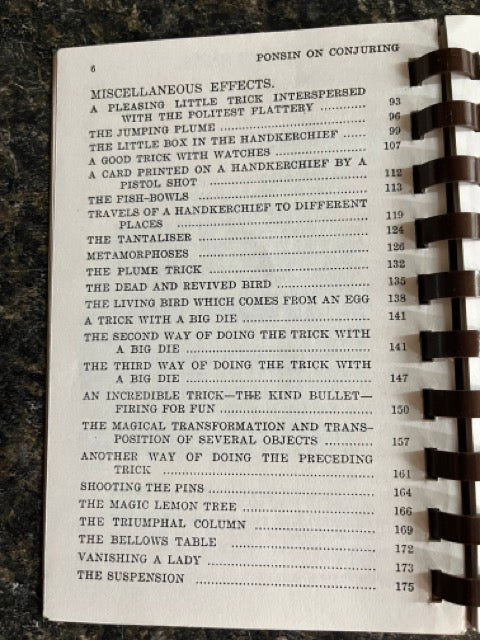 Ponsin On Conjuring is full of incredible material. Even today, some of these effects are groundbreaking! There are intriguing effects with cards, with coins and a section on the Cups and Balls (Here you will find a handling using metal balls-the same idea with which Paul Gertner created a sensation!) There are impromptu effects, mental routines, effects with watches, coins, dice, handkerchiefs and more!
