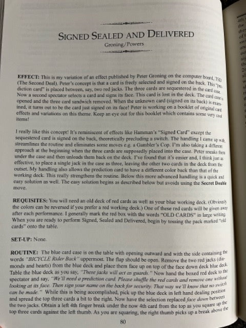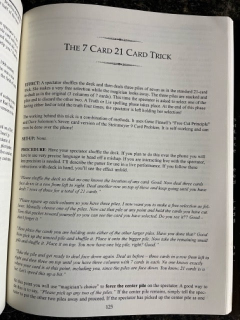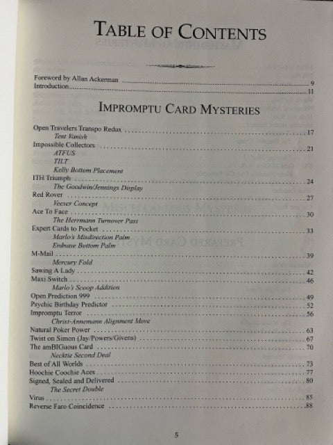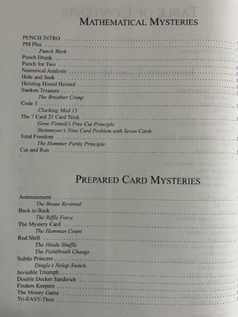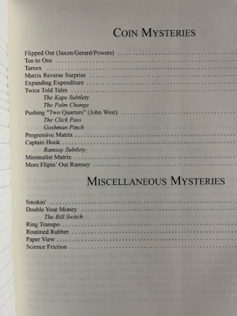 The book contains 20 "Impromptu Card Mysteries"; 12 "Mathematical Mysteries"; 10 "Prepared Card Mysteries"; 11 "Coin Mysteries"; and 6 "Miscellaneous Mysteries"