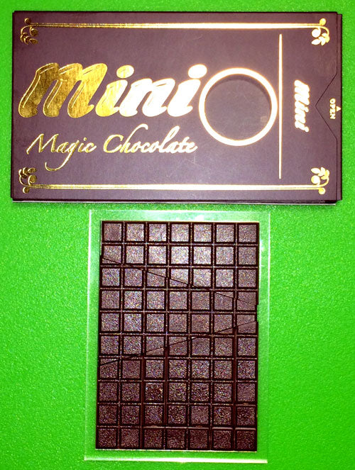 Effect: An impossible puzzle that gives the impression of magic. You show a bar of Mini Chocolates with 70 pieces of chocolate. You remove one piece leaving 69. You then rearrange the pieces so it looks like you still have 70 pieces left — an impossibility. But that is not all. You repeat the sequence two more times so a total of three pieces are removed and left in plain sight yet the chocolate bar is still complete with 70 countable pieces! There is even a plastic frame included which fits snugly around the 70 piece puzzle both before and after the three pieces are removed.