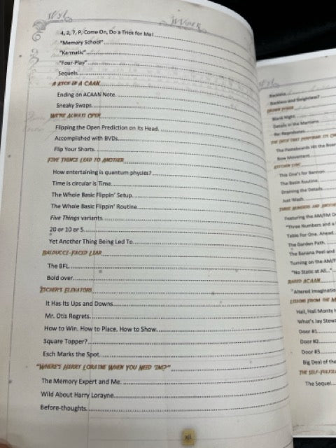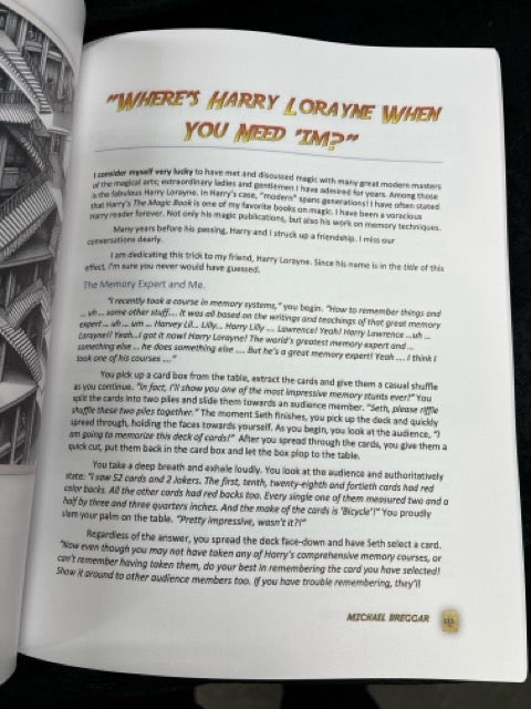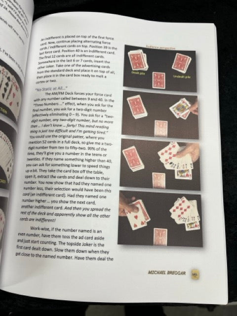 They include "mystery card" effects, transpositions, a quirky magic square performed with cards and an unbelievable kicker ending, weird card locations, "un-memory" demonstrations, hands-off Oil and Water, Open Prediction and ACAAN effects. And more than you can crack a whip at! - Plus - there is Michael's blockbuster Bad Bikes with a huge section of cool variations.