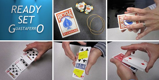 7. Bound to Triumph– A topsy-turvy shuffled deck that is wrapped with a rubberband manages to unshuffle itself, even while in a spectator’s hands.