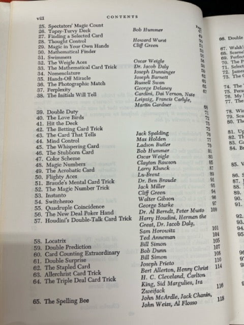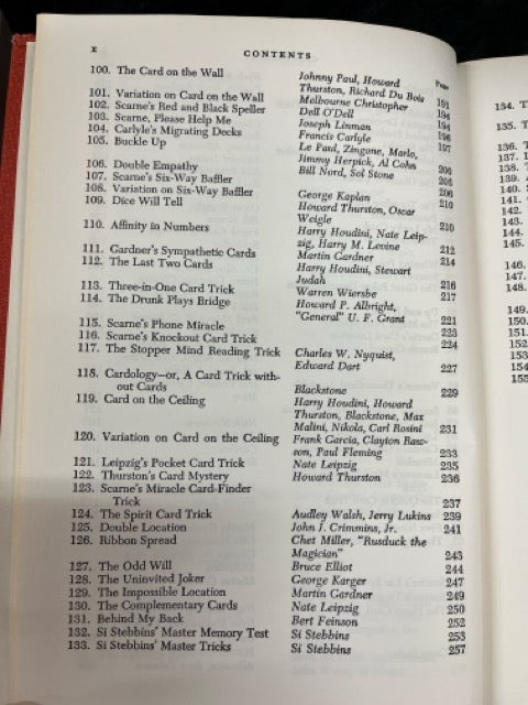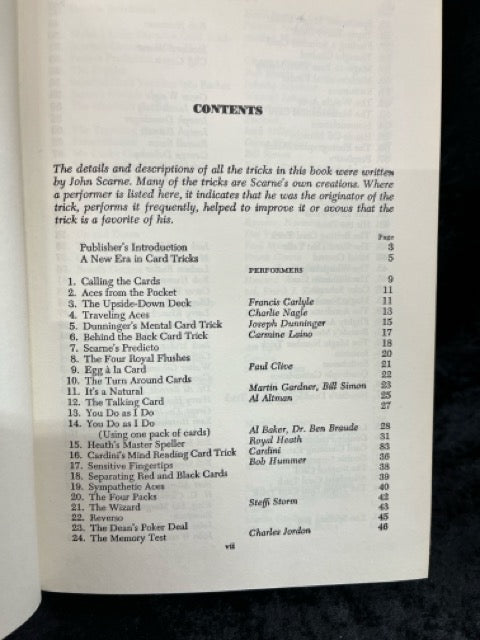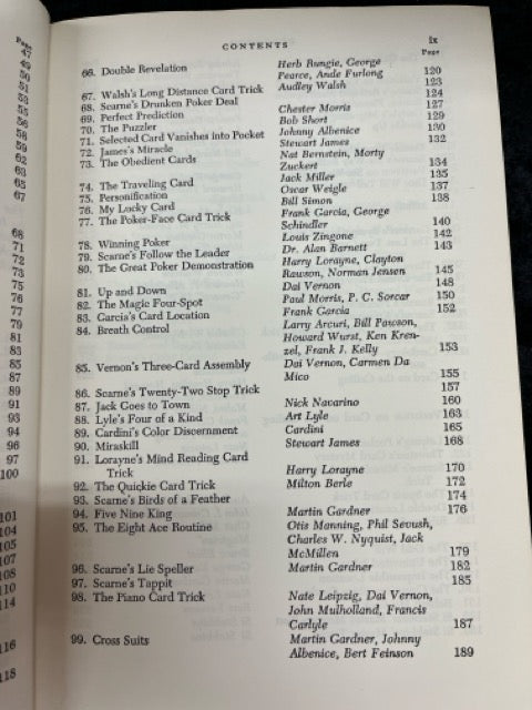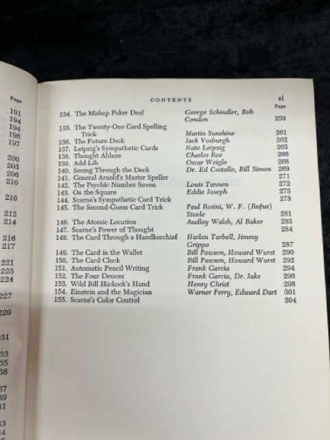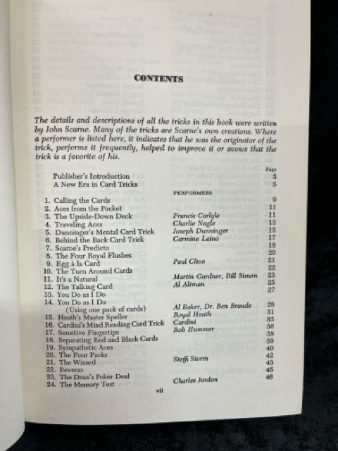 Scarne, the world's number-one card wizard, reworked 155 classic card tricks to eliminate the need for sleight-of-hand. Simple instructions and clear diagrams illustrate Houdini's "Card on the Ceiling," Blackstone's "Card Trick Without Cards," Carlyle's "Piano Card Trick," Milton Berle's "Quickie Card Deal," and Scarne's own "Drunken Poker Deal" and "Knockout Card Trick."