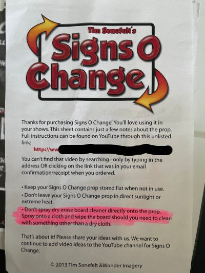 You show a board with a word written on it. You turn the board over to show a different word on the back. You then turn the board again to show the original word has changed. You turn it over one more time to show the final word has changed again.