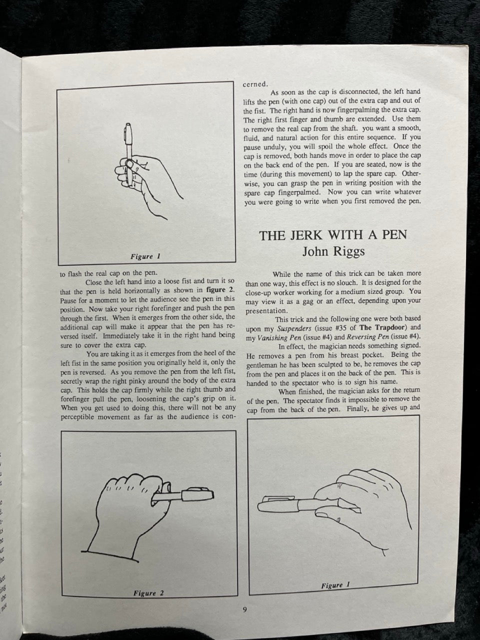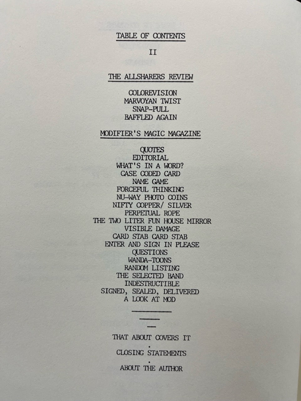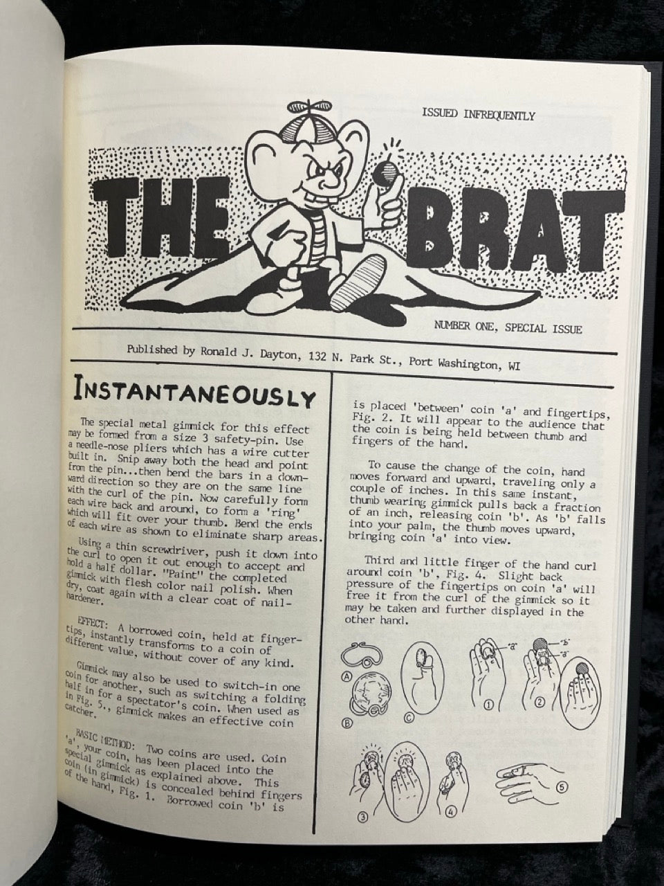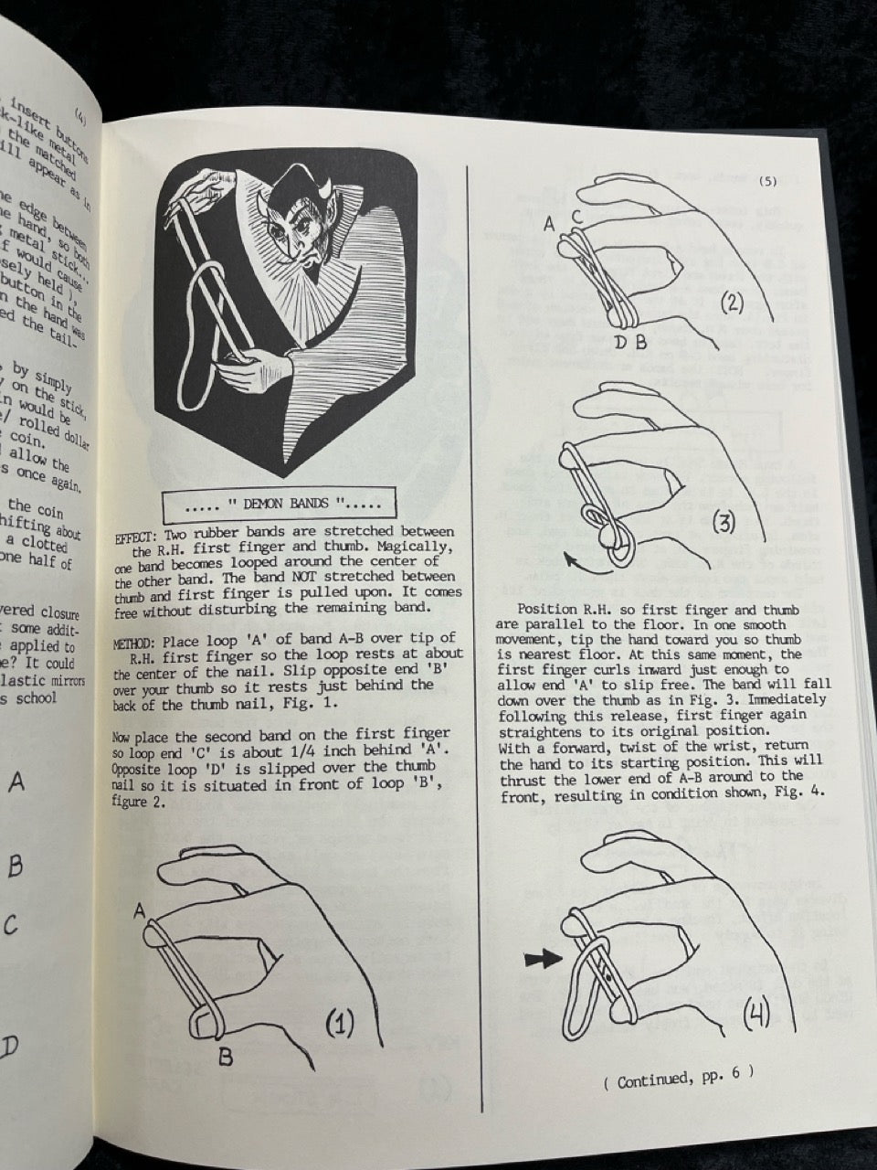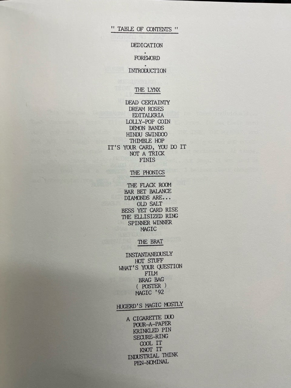 Ron uses the format of both older and newer magic magazines to present you with new and original magic you will enjoy and want to learn. In 152, 8-1/2" by 11" pages, Ron presents 43 new tricks, 15 articles, 272 illustrations, and seven full-page magic magazine covers you will recognize. Included is magic with coins, cards, pens, rubber bands, thimbles, safety pins, mentalism, and more. Printed on acid-free paper, this is a beautiful, collector-quality book. It has a silver cartoon on the black front cover plus silver lettering on the spine.