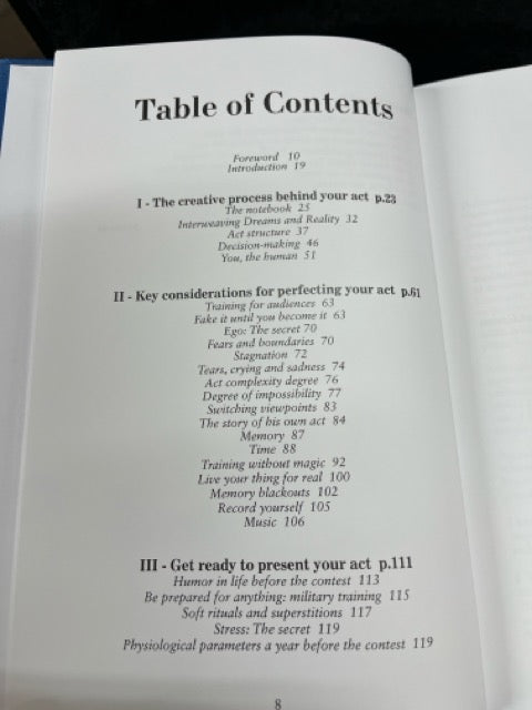 The book is divided into several chapters that detail the various stages of creating and perfecting an act. Markobi guides readers through his creative process, exploring the psychological and technical challenges faced when preparing a magic act. He offers practical advice on overcoming obstacles and continuously improving performance.