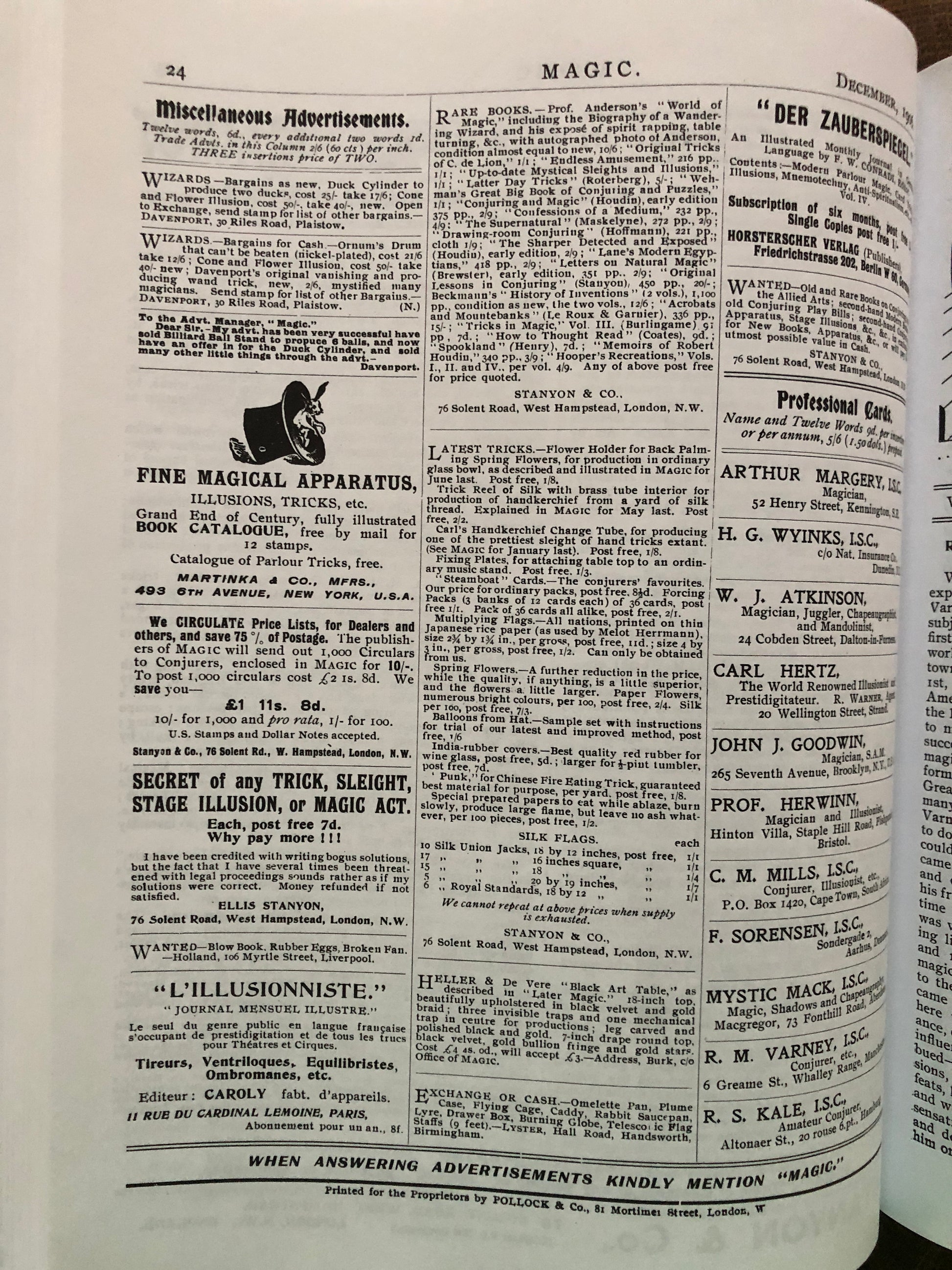 Tricks! Full Treatises! Book Reviews! News! Magicians' Photos! Bioraphical & Descriptive Matter! Advertisements! Bibliographies!