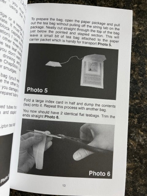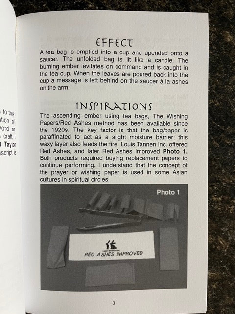 Effect: A tea bag is emptied into a cup and upended onto a saucer. The unfolded bag is lit like a candle. The burning ember levitates on command and is caught in a tea cup. When the leaves are poured back into the cup a message is left behind on the saucer a la ashes on the arm.