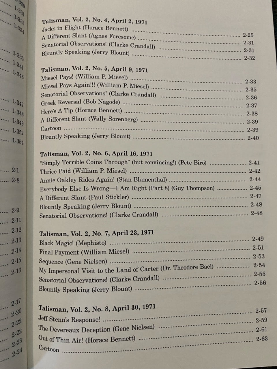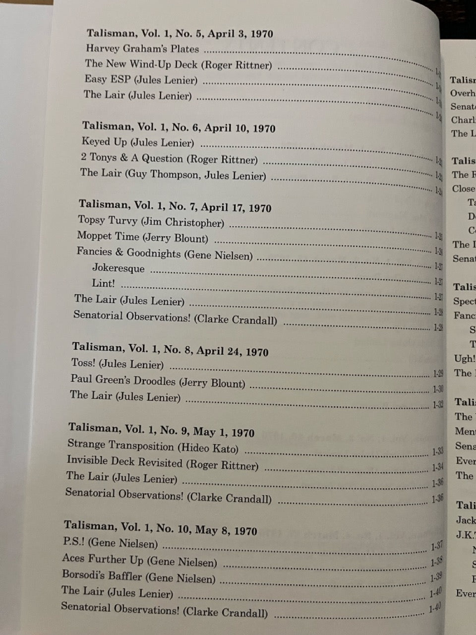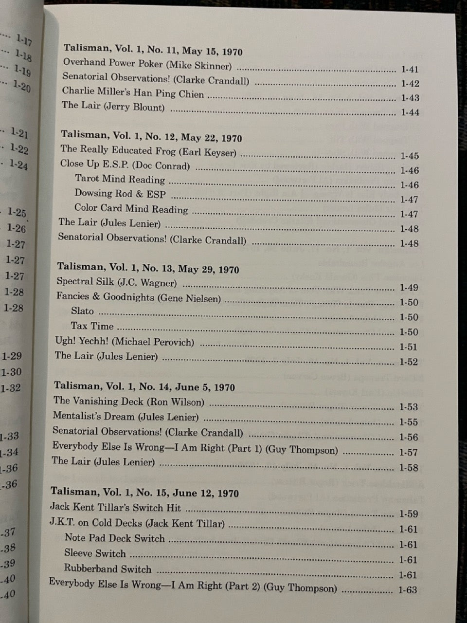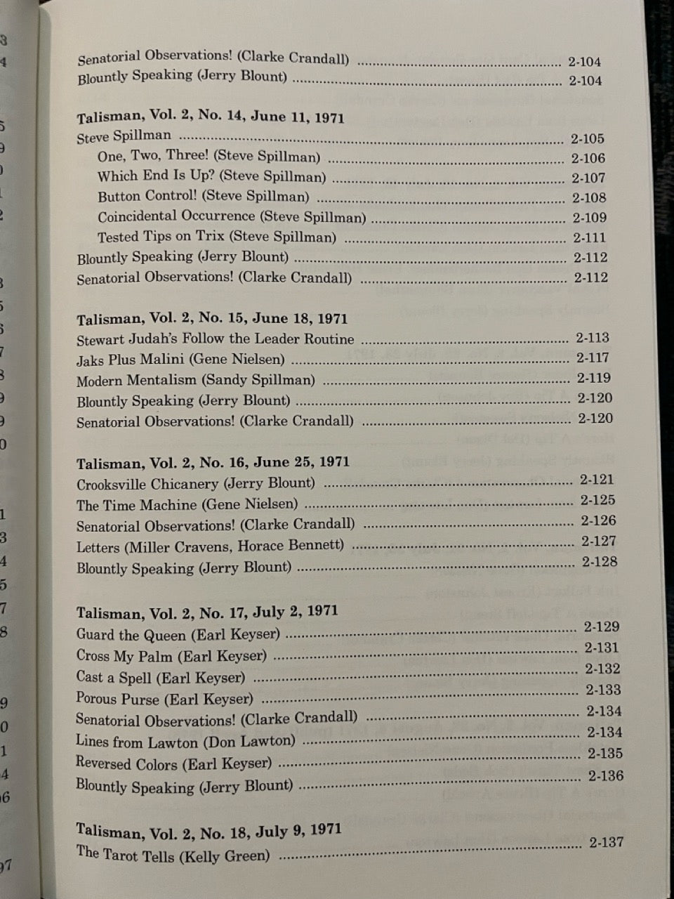 Among the contributors are Mike Skinner, Jules Lenier, Charlie Miller, Francis Carlyle, Bruce Cervon, Martin Lewis, Ron Wilson, Gene Nielsen, Hideo Kato, Clarke Crandall, J.C. Wagner, Jack Kent Tillar, Gerald Kosky, Steve Spill, Bob Wagner, Mike Perovich, Matt Corin, Milbourne Christopher, Horace Bennett, Pete Biro, Bill Miesel, Don Lawton, Jon Racherbaumer, and many more.