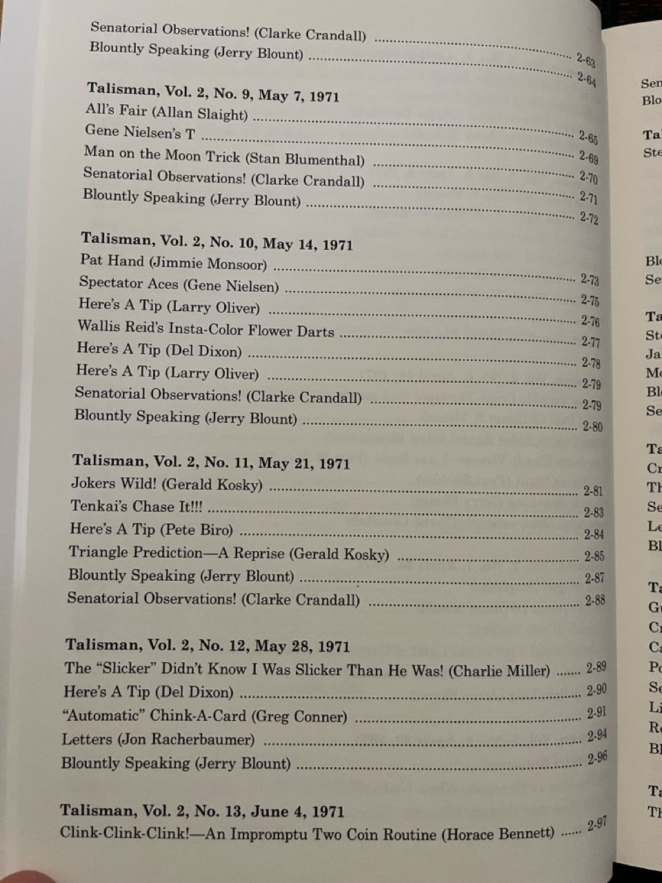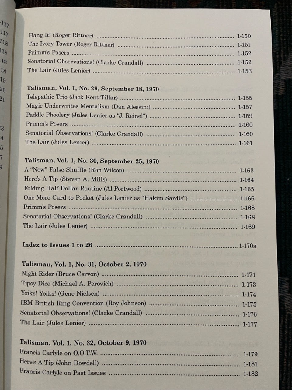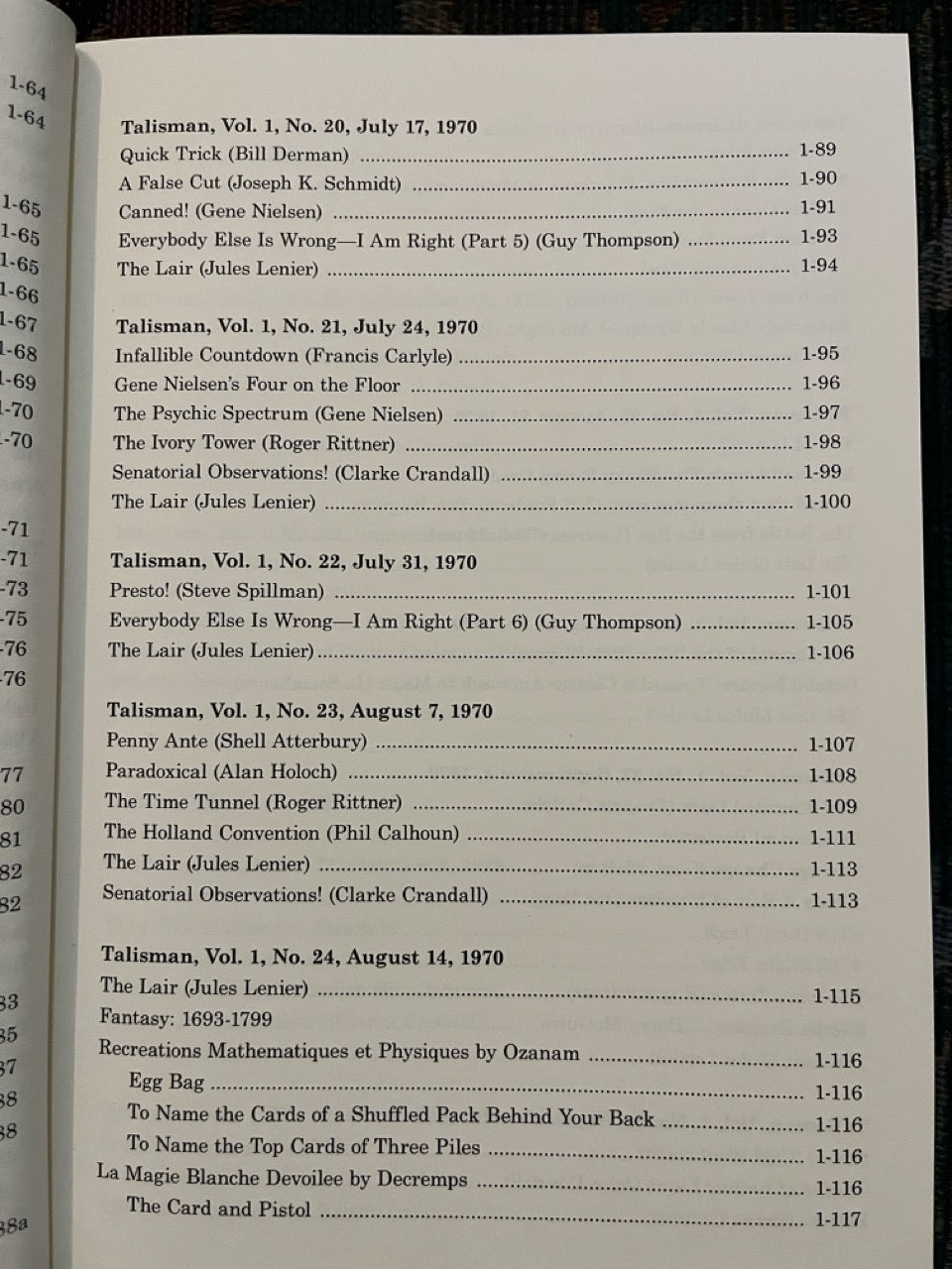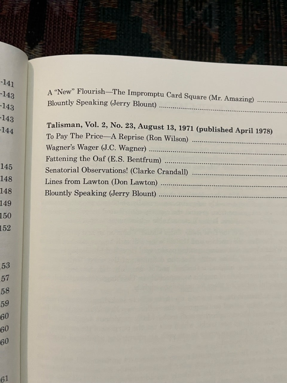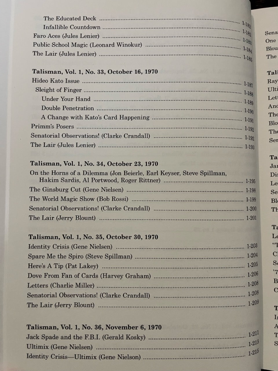 Among the contributors are Mike Skinner, Jules Lenier, Charlie Miller, Francis Carlyle, Bruce Cervon, Martin Lewis, Ron Wilson, Gene Nielsen, Hideo Kato, Clarke Crandall, J.C. Wagner, Jack Kent Tillar, Gerald Kosky, Steve Spill, Bob Wagner, Mike Perovich, Matt Corin, Milbourne Christopher, Horace Bennett, Pete Biro, Bill Miesel, Don Lawton, Jon Racherbaumer, and many more.