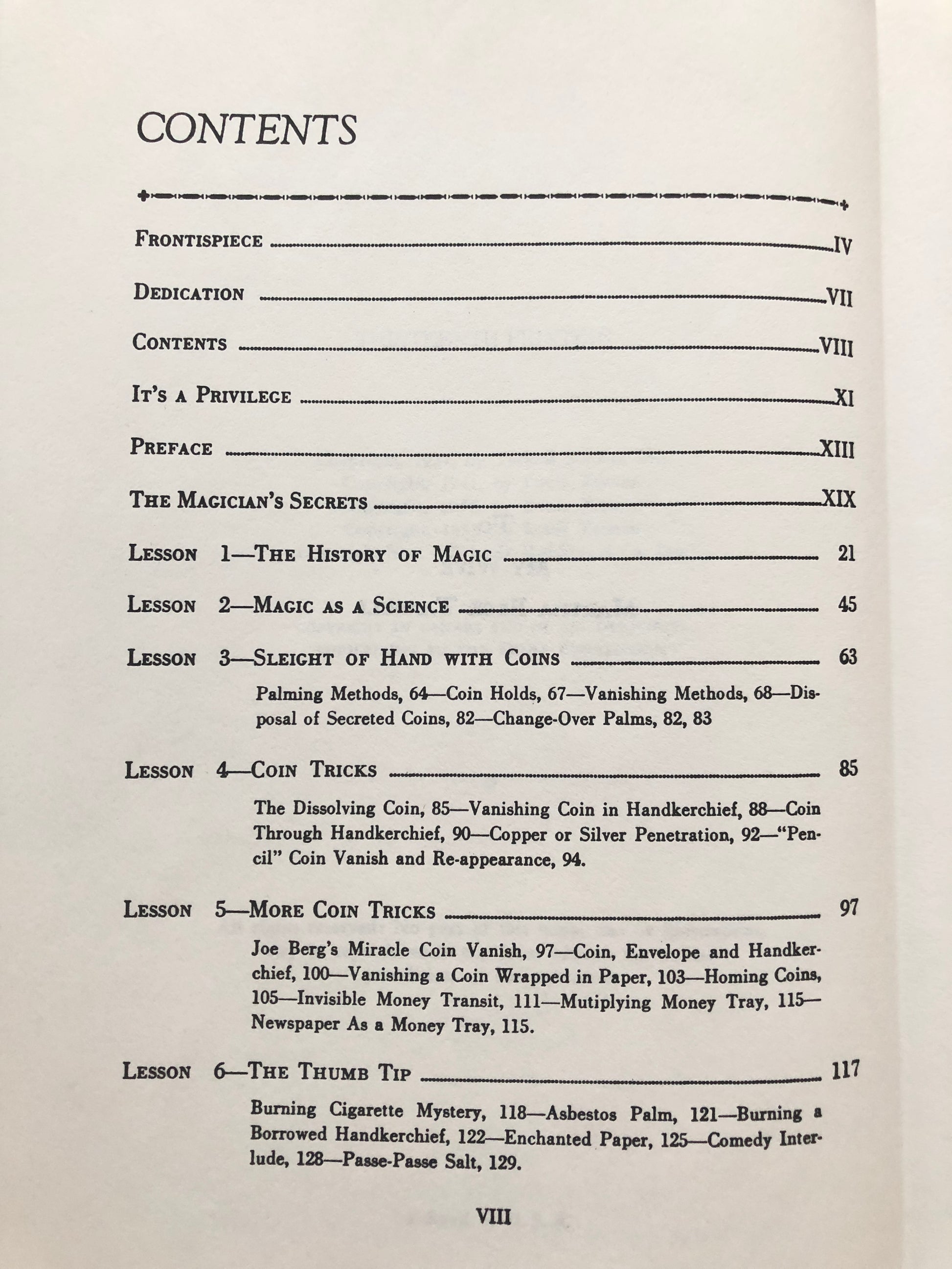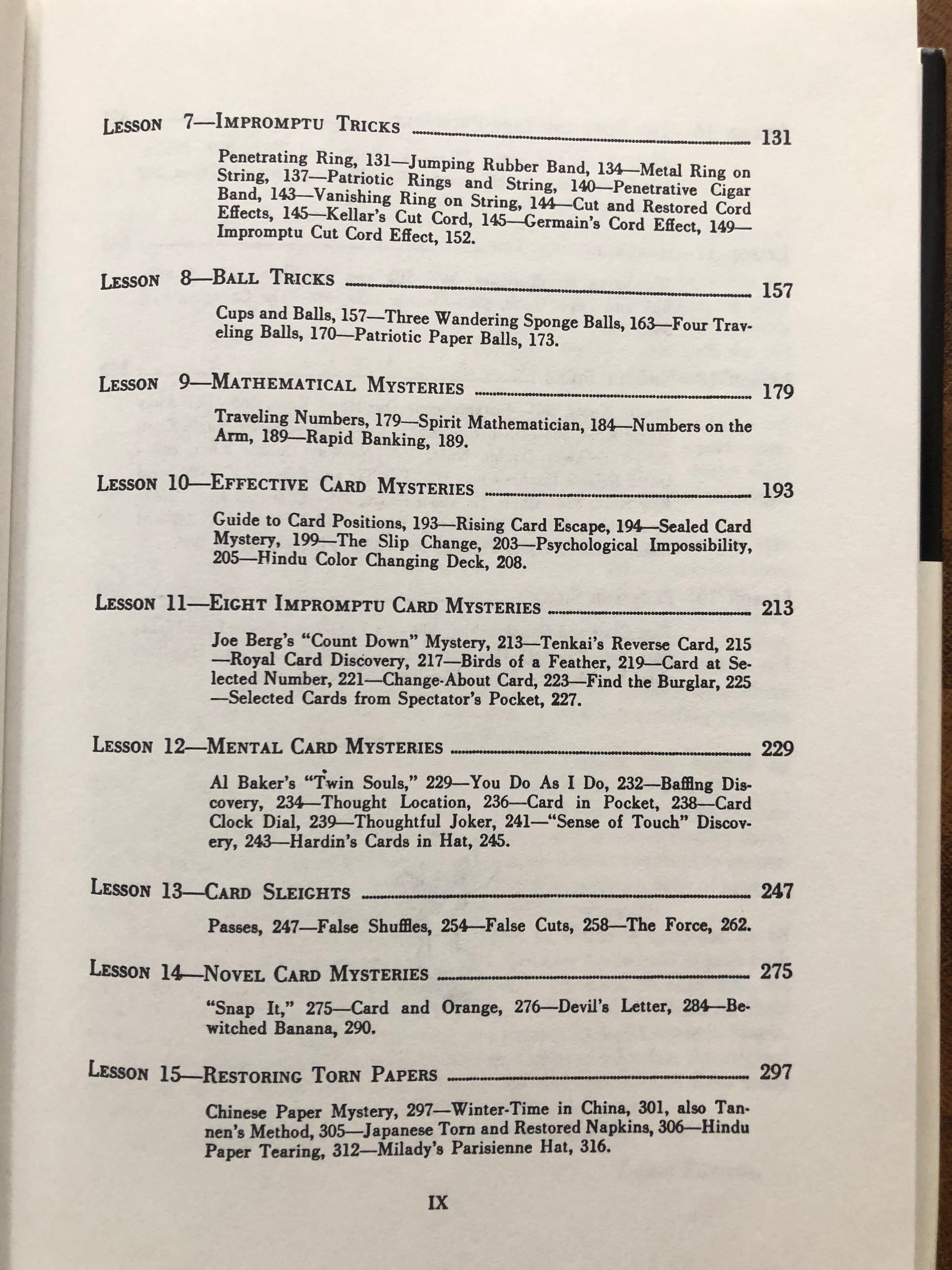 The most respected course in magic! The classic volumes cover every aspect and interest in the art of magic performance. A must have for every magic library! THIS VOLUME INCLUDES: History of Magic, Magic as a Science, Sleight of Hand with Coins, Coin Tricks, More Coin Tricks, The Thumb Tip, Impromptu Tricks, Bill Tricks, Mathematical Mysteries, Effective Card Mysteries, Impromptu Card Mysteries, Mental Card Mysteries, Card Sleights, Novel Card Mysteries, Restoring Torn Papers, Rope and Tape Principle, Handkerchief Tricks, Knotty Silks, Eggs and Silks. 19 lessons. 410 pages (hardbound). 918 illustrations.