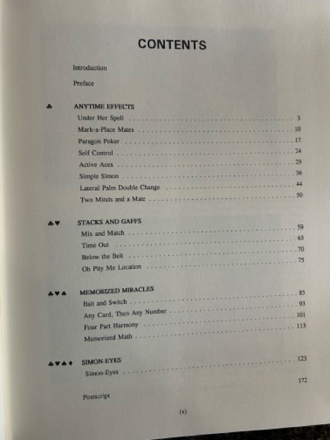 Card magic for everyone, from the self-working, hands off Self Control Lie Speller and the two-deck Mix and Match, to the commercial (and ribald) Under Her Spell. Paragon Poker offers a three-phase card cheating demonstration (with an unexpected double climax). Bait and Switch and Four Part Harmony are memorized deck masterpieces, and in his essay Memorized Math Simon continues his trademark in-depth analysis of memorized deck principles. Mark-a-Place Mates offers a flexible utility move, while Active Aces efficiently combines a visual vanish of the Aces with the Henry Christ Fabulous Ace reproduction. The 50 page treatise on the mental blockbuster Simon-Eyes is worth its weight in gold to the performing mentalist...plus Two Minds and a Mate, and lots more. 173 pages