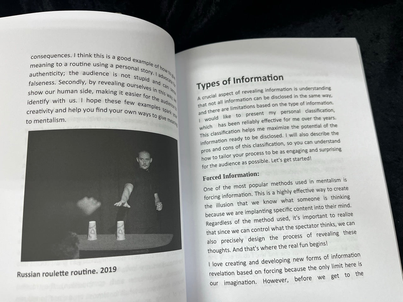 "In my opinion, what truly matters in mentalism is the ability to create unforgettable memories, images, and stories that your audience will remember forever. I believe it is a true art to be able to do this, and this book is all about that! I have spent the last six years researching and experimenting with my craft to find the right answer. This is a collection of ideas and principles that will inspire you and explain how to reveal information in a unique, engaging, and surprising way. I will share with you numerous routines that demonstrate how to apply these ideas."