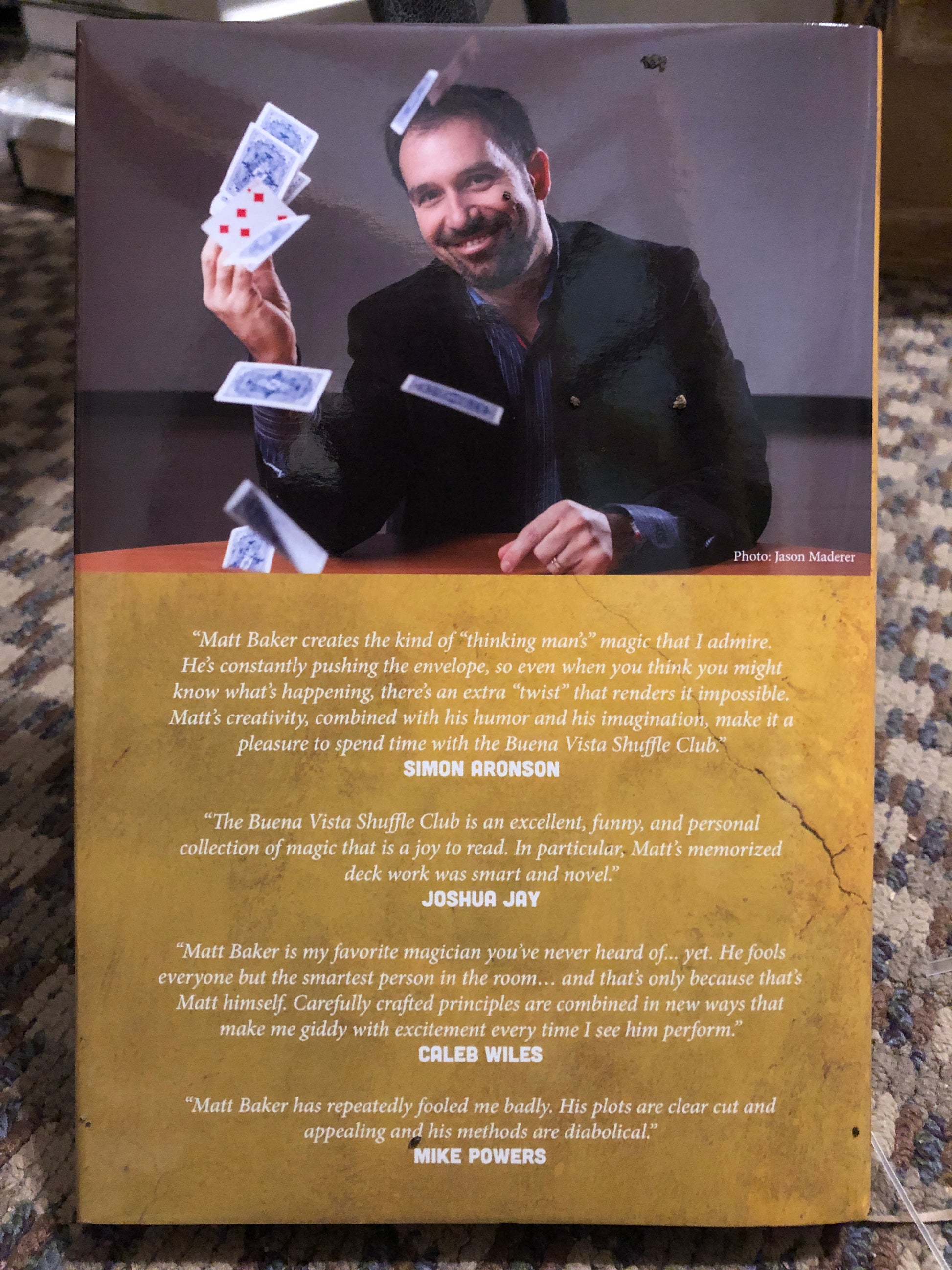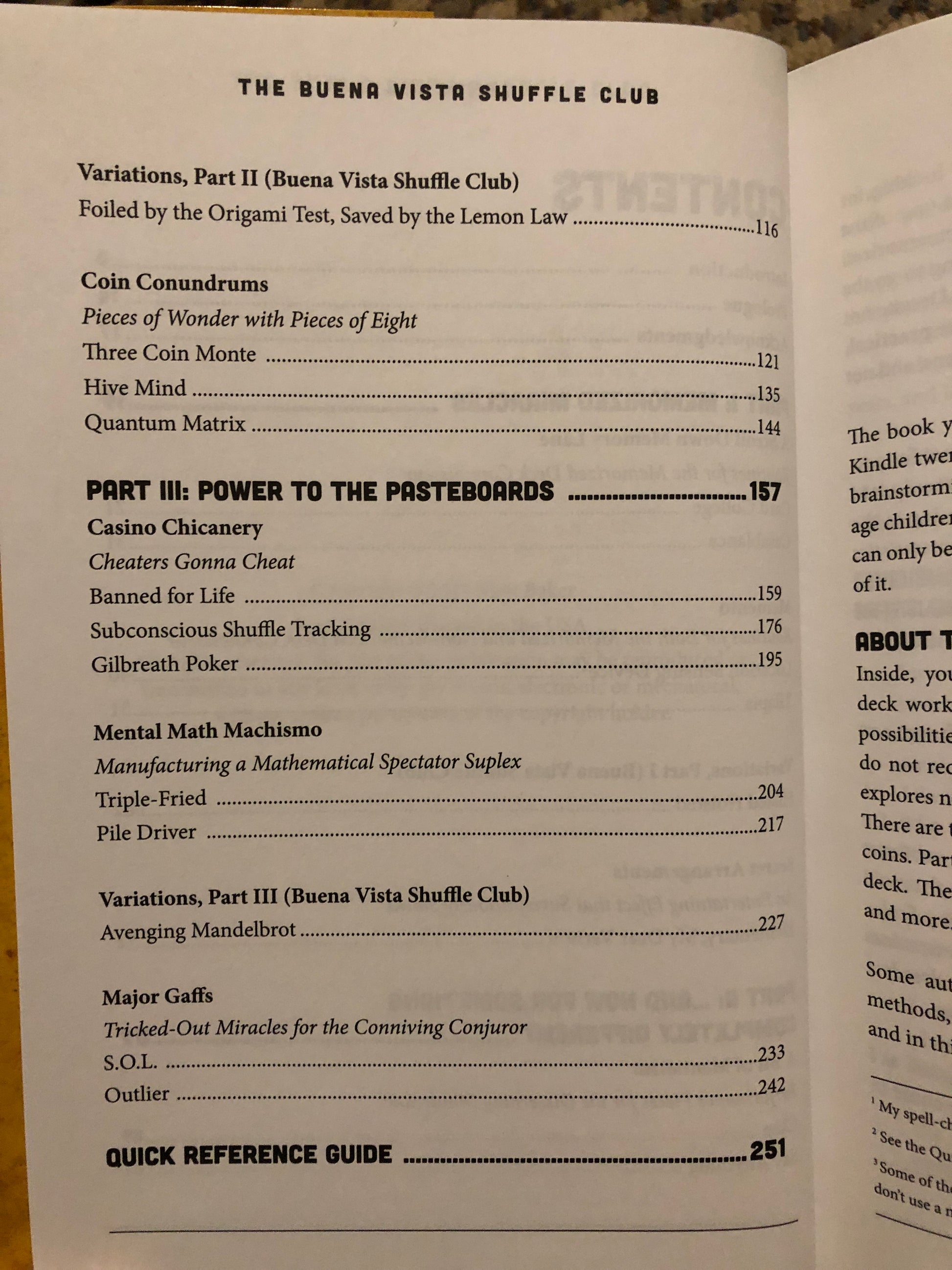 The Buena Vista Shuffle Club is unlike any other magic book you've read. It combines original methods, plots, and scripts with "jam sessions" between a fictitious group of magicians who analyze and deconstruct the effects in the book. Memorized deck aficionados will have a field day: there are nearly 100 pages devoted to effects with a memorized deck. But the book also contains blockbuster mentalism, impromptu effects with cards and coins, new applications of underground math principles, and "one degree" touches on classics of magic such as Matrix, Shuffle-Bored, and Bill in Lemon. Inside these pages you will find: