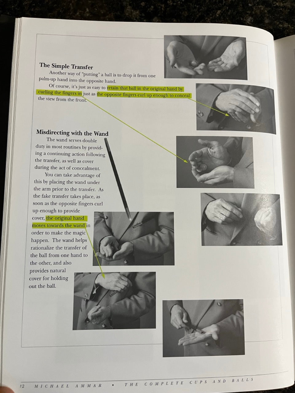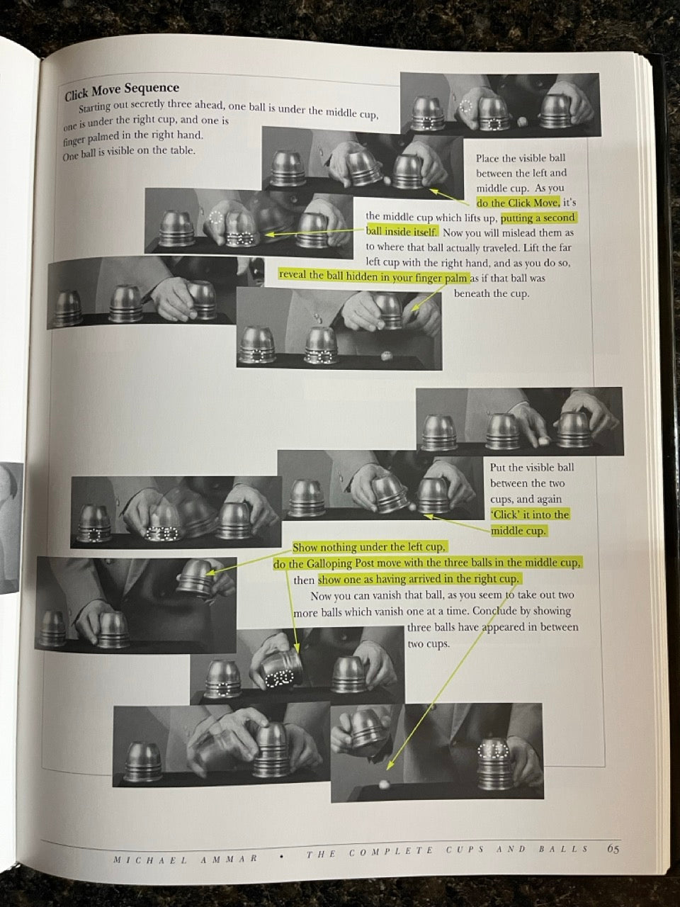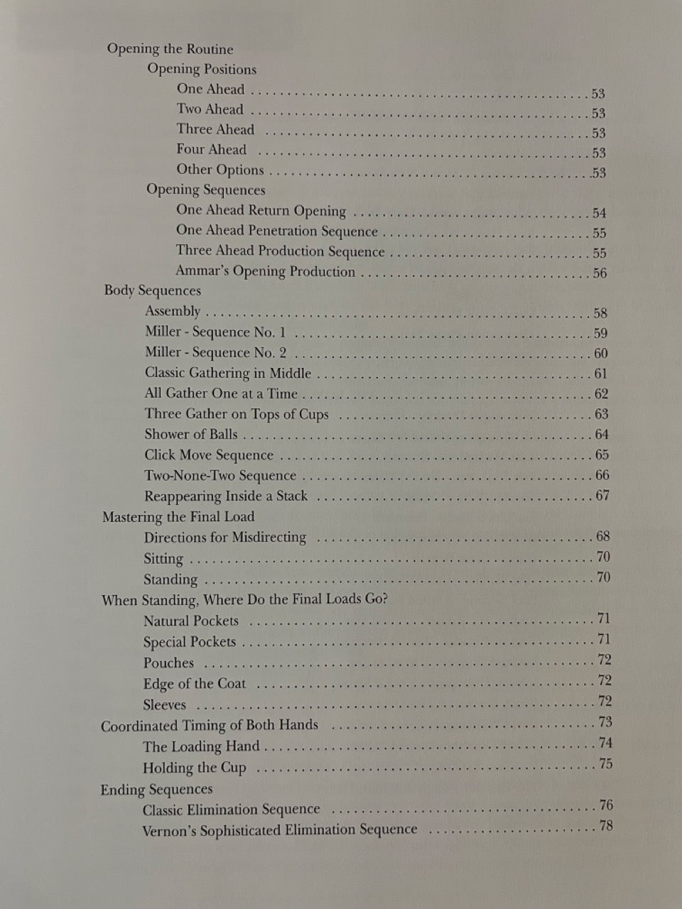 Over 750 photographs, 172 pages text highlighted in color to show you exactly what the key points are. Special attention is placed on those four highly transferable skills which grow stronger as you study the Cups & Balls; Acting, Timing, Routining, and Misdirection. You'll discover classic wand moves every sleight of hand performer should know, opening positions and sequences, body sequences, secret loading sequences, as well as final rhythms that create the powerful misdirection to cover your final loads.