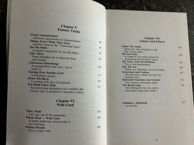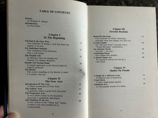 Routines include: I’ll Find It The Easy Way, An Ambitious Surprise, The Double Lift, Double Lift Second Deals, The Buckle, Introduction Of The Aces, The Progressive Aces, Still Thinking Of An Ace, Rapid-Fire Reversals, Loving Couples, An Alternate Puzzle, Colorfusing Monte, A Quick-Change Act, A Spade Of A Different Color, Count Down, Ambitious Five, Visual Transposition, Things Aren’t What They Seem, On The Make, Take Three, Unforseen Interchange, Turning Over Another Leaf, Down The River, Ten Hand Poker Deal, That’s Wild, Whole Deck-Wild Card, Wildest Dreams, Follow The Leader, Oil And Water, Oil Water And The Oil Barons, Face The Ace, Everywhere And Nowhere, Backward Everywhere And Nowhere, and The Rising Cards.