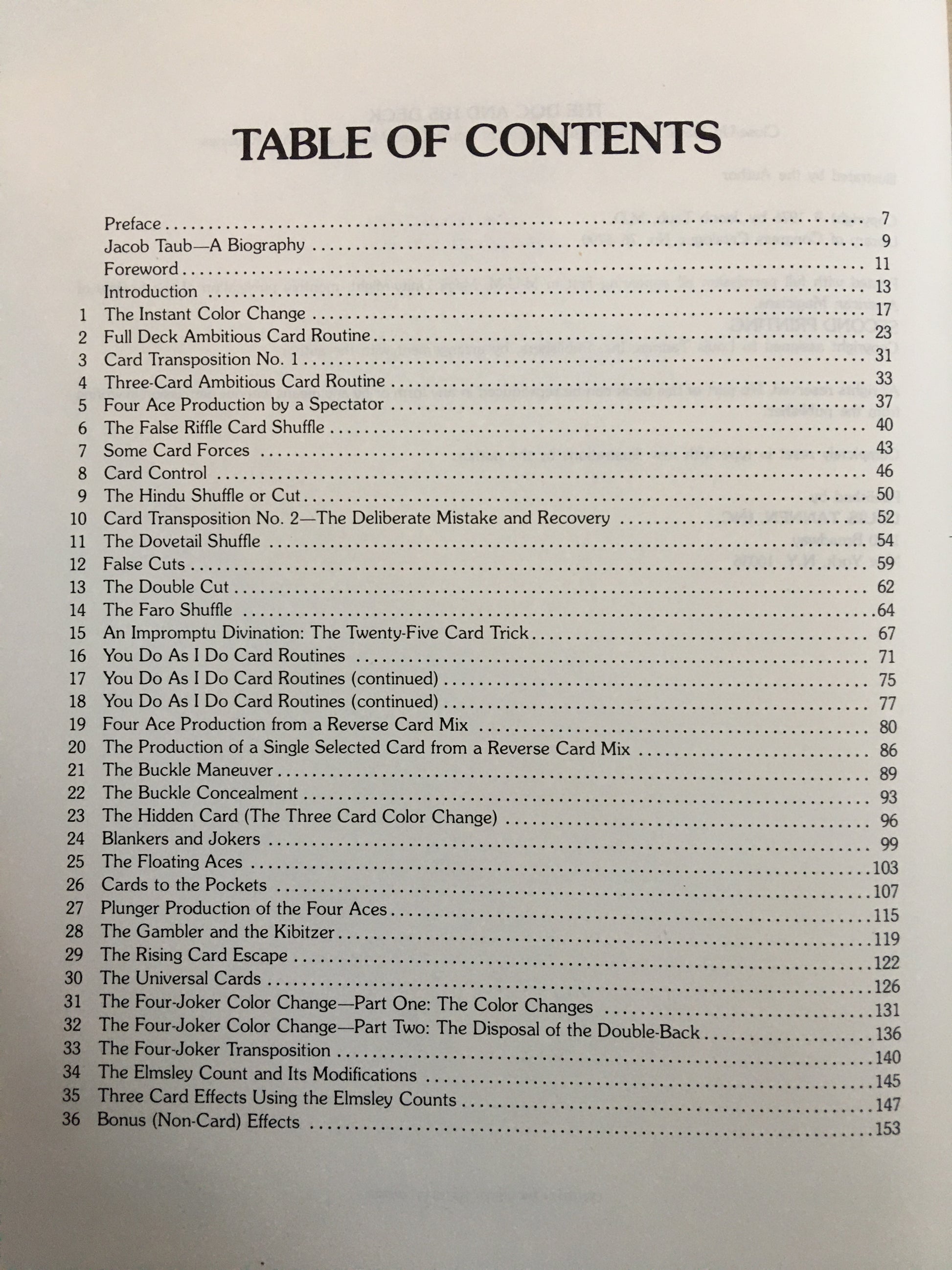 This book's purpose is to teach something about the art of close-up magic; not just to describe some card effect. Each chapter consists of the text, captioned drawings, and a summary of moves and slight. Thus lights are comparatively few but basic.