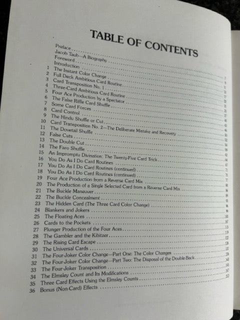 This book's purpose is to teach something about the art of close-up magic; not just to describe some card effect. Each chapter consists of the text, captioned drawings, and a summary of moves and slight. The sleights are comparatively few but basic.