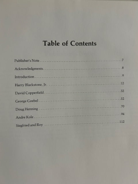 This contains detailed biographies with superb photos of six prominent magicians: Harry Blackstone, Jr, David Copperfield, George Goebel, Doug Henning, Andre Kole and Siegfried & Roy.