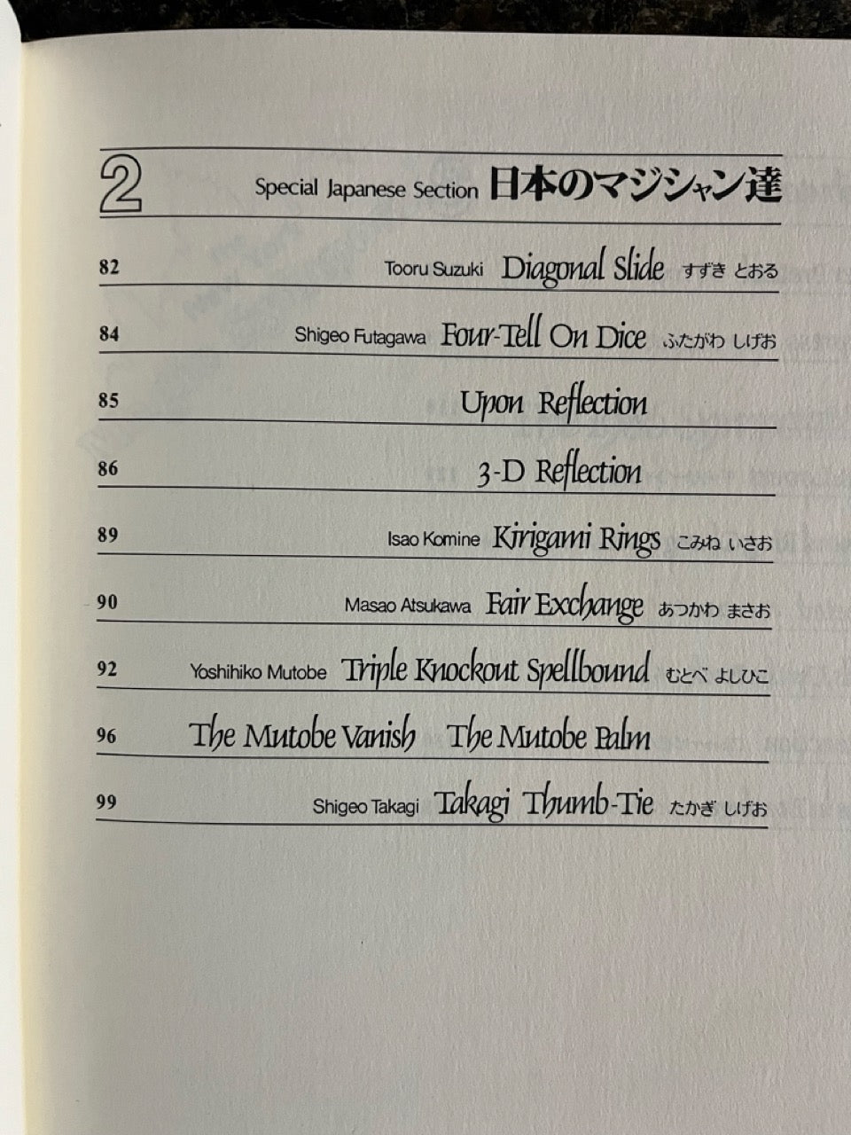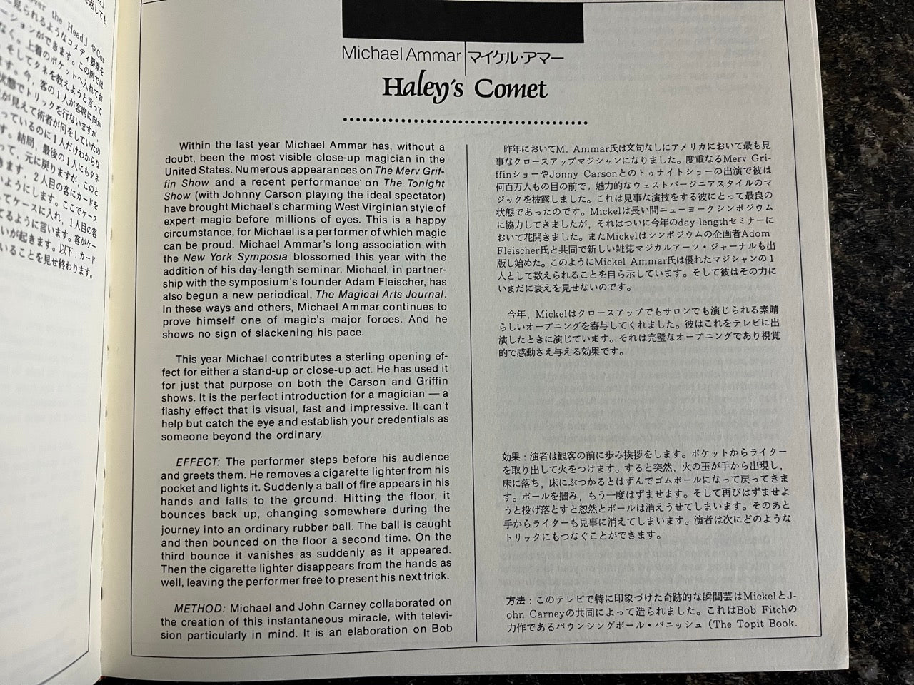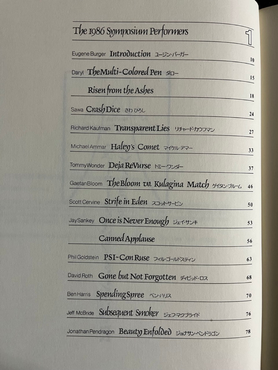 In 1986 Adam Fleischer transformed his bi-coastal New York Magic Symposium into an international event by holding it in Tokyo, Japan. The annual Symposium collection that resulted in this book features a split column format, with the left hand side in English and the right hand side in Japanese.