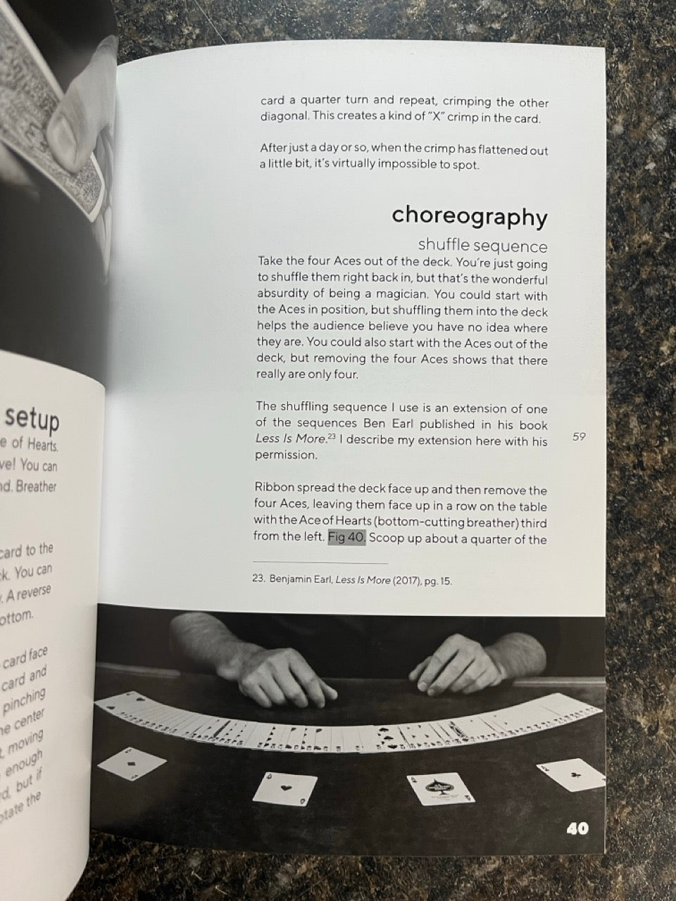 This book is broken into two main parts. The first of which features Michael's go-to effects. These are the routines he performs regularly in both his professional and casual work. There are innovative routines like "False Dichotomy" where two people seemingly experience the same card trick differently before both realities are proven to be true, as well as fun and quirky takes on classics like Card Under Glass and Triumph.