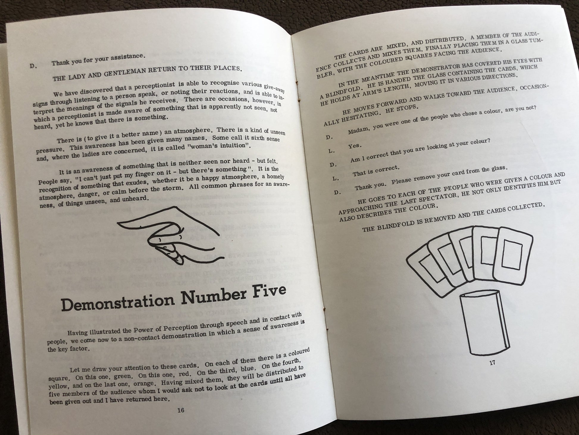 These routines are done as if they are actual demonstrations of mind reading, presented in a lecture format.