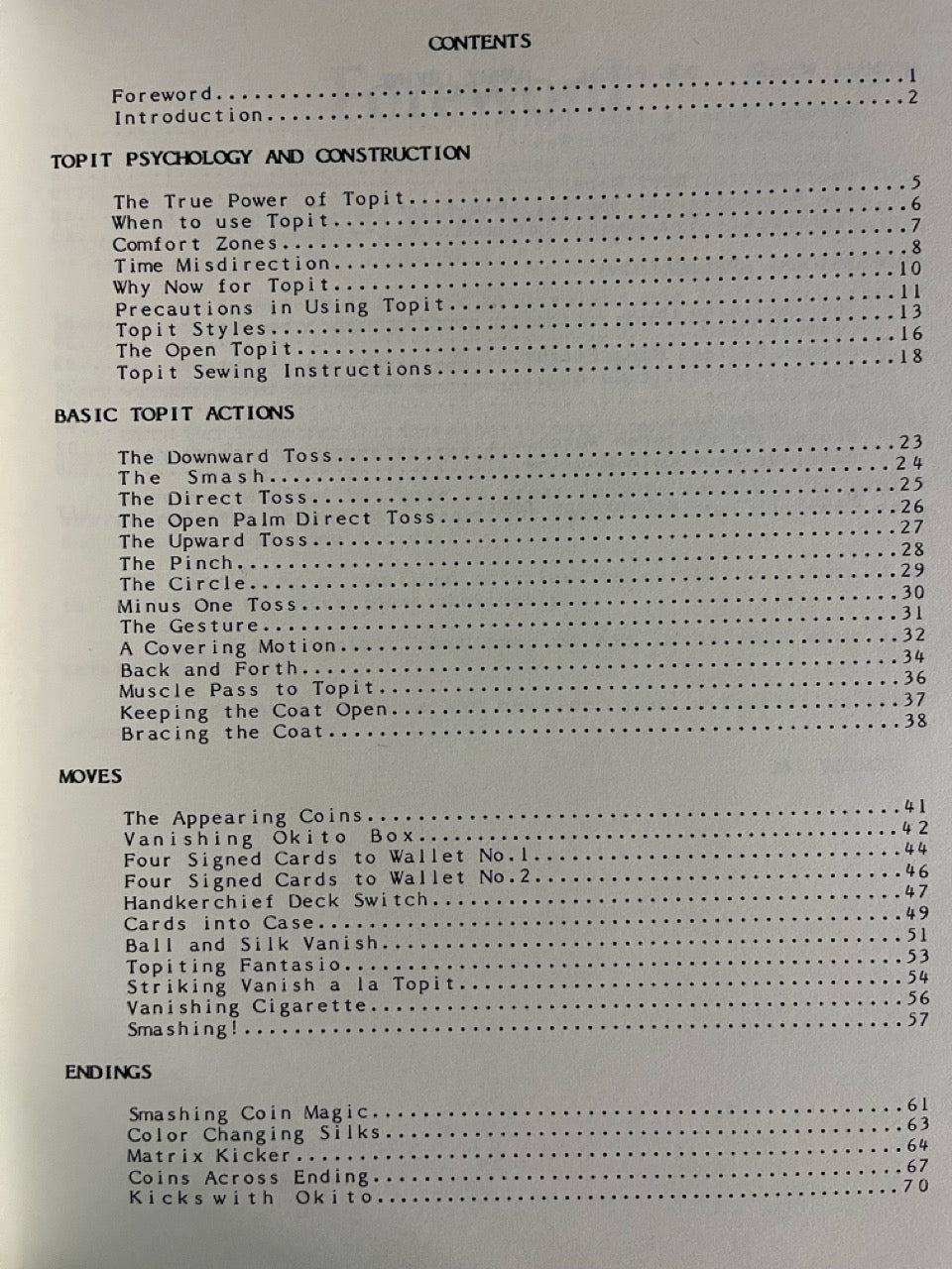 The Topit was first developed by pickpockets and shoplifters for the purpose of ditching their goods. This book goes into the psychology, construction, basic actions, and moves of the Topit.