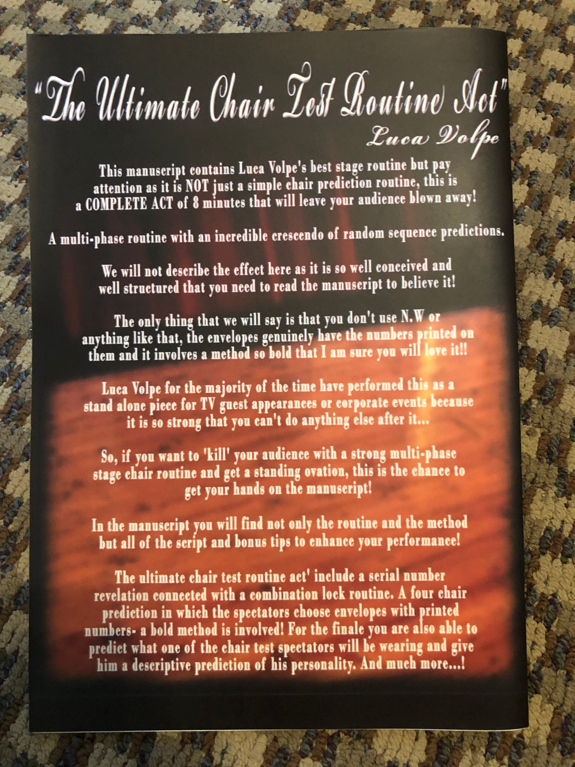 This manuscript contains Luca Volpe's best stage routine but pay attention as it is NOT just a simple chair prediction routine, this is a COMPLETE ACT of 8 minutes that will leave your audience blown away!