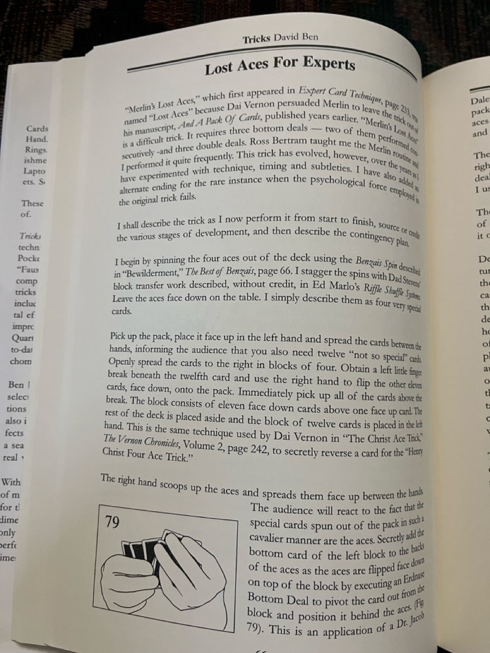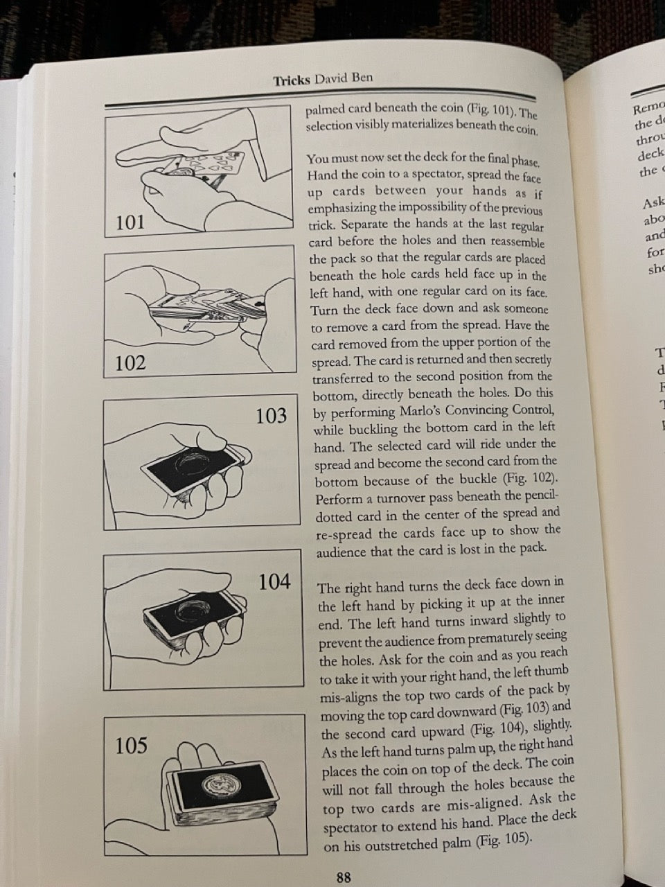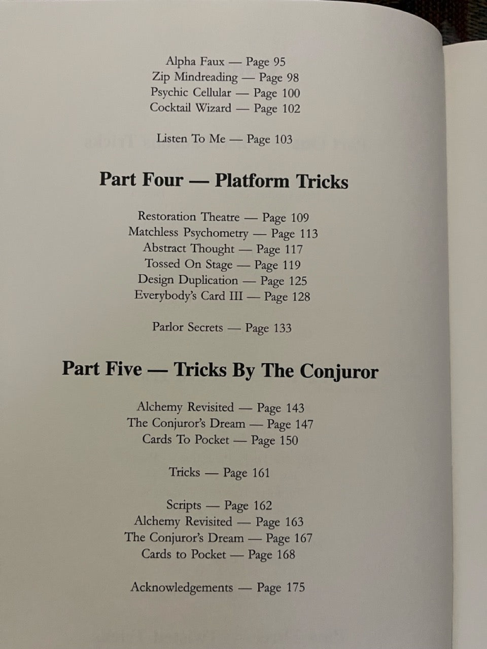 Tricks contains material for all skill-levels, from technically demanding renditions of the “Cards to Pocket” and “Open Travelers” to self-working “Faux Automata” using cellular phones and laptop computers. In between, close up miracles, parlor tricks and stage effects abound. Standout effects include “Postage Prediction,” a no-nonsense mental effect with postage stamps; “Bad Habits,” an improved, logical version of the “Cigarette Through Quarter” plot; and “Matchless Psychometry,” an up-to-date version of Annemann’s classic “Pseudo-Psychometry.”