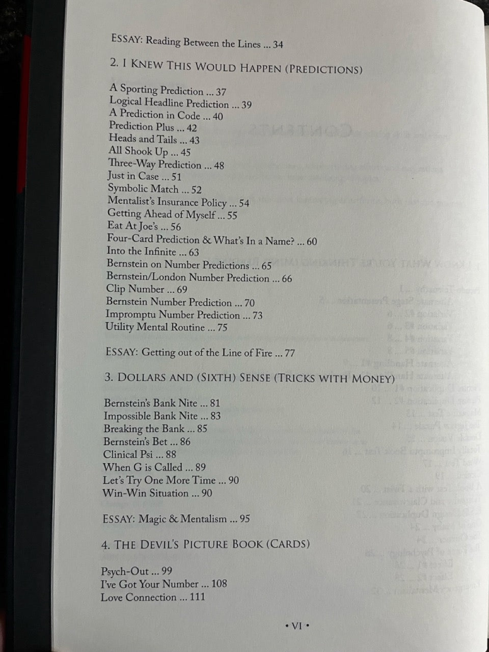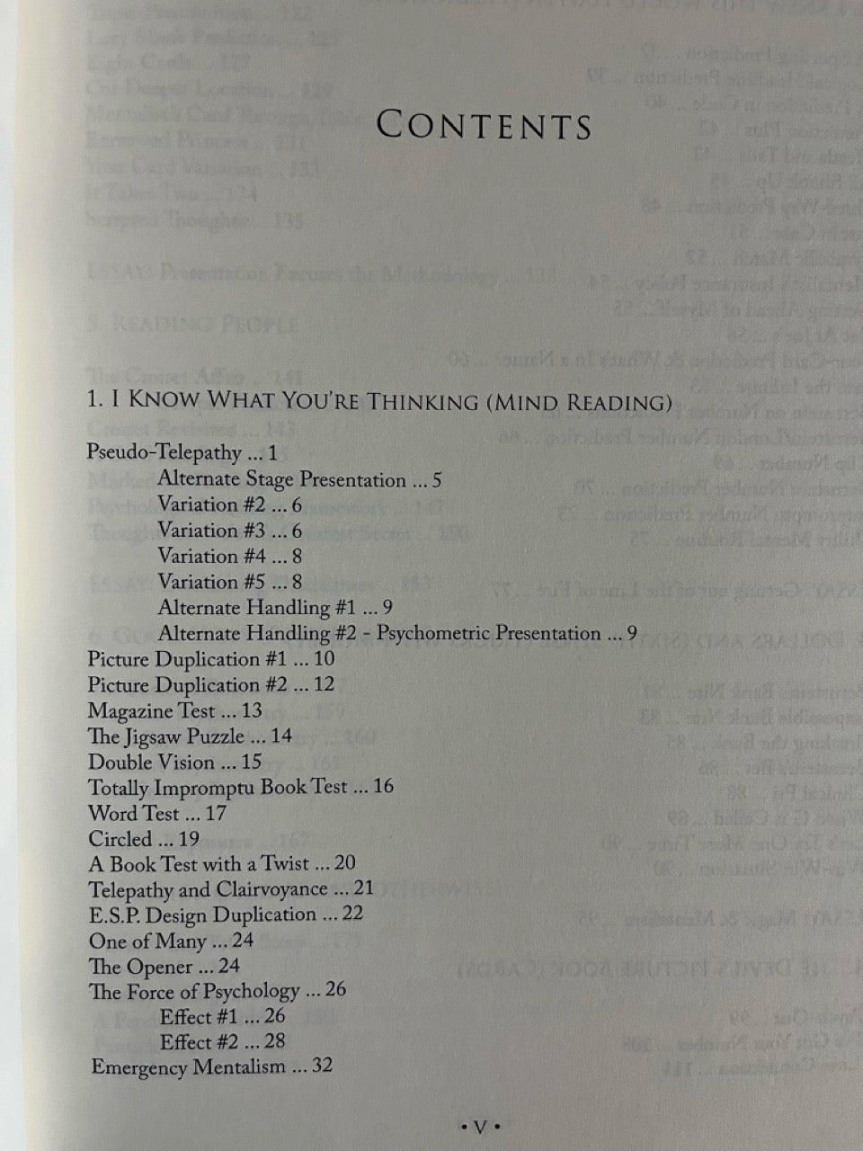The book outlines mysteries with the most basic of objects: slips of paper, cards, and money, as well as inexplicable feats of thought reading: predictions, mind reading feats, psychometry, utility techniques for obtaining secret information, cold reading scripts and techniques, and more. Ten new essays compliment the tricks themselves, each written specifically for this book.
