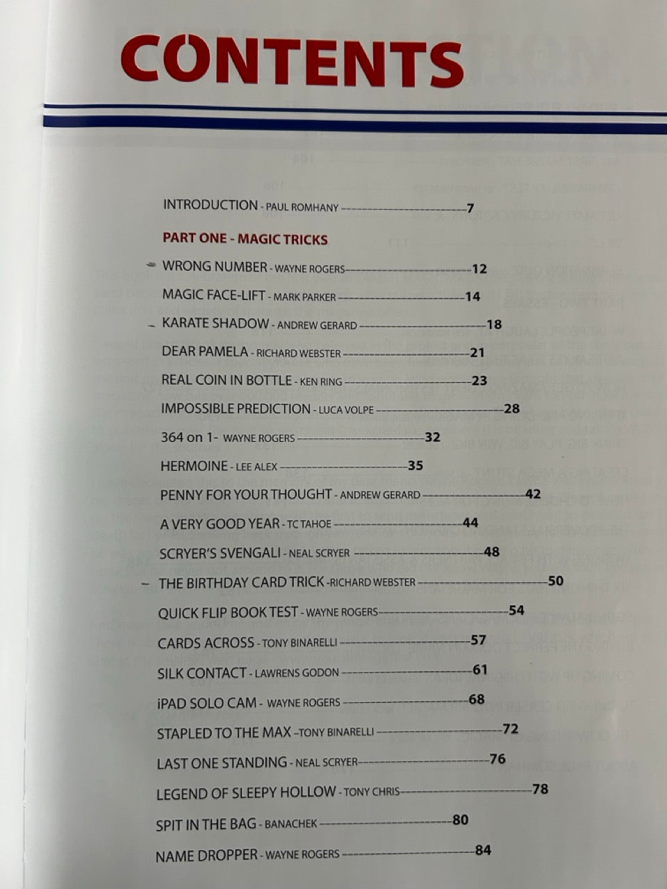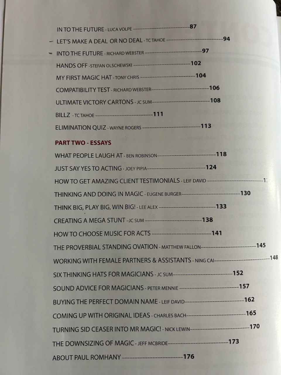 You will get over 30 magic tricks from the first year and 15 essays, PLUS a bonus trick section ONLY available to those who purchase the book. There is a wide range of magic covered from close-up, mentalism, kids magic to stage illusions. The essays by some of the world's leading performers discuss how to get more work, sound system advice, advertising techniques and more.