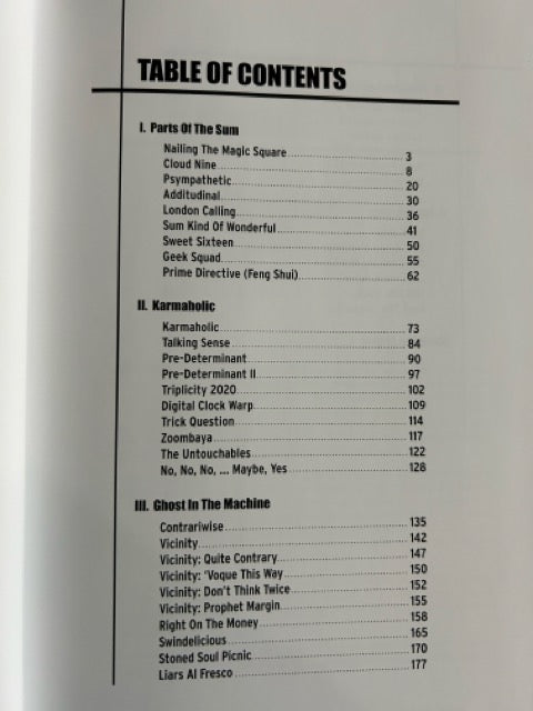 And you've never seen a magic square quite like this. The first chapter of Very Hush-Hush, "Parts of the Sum," deals directly with Bannon's brilliant pasteboard-driven takes (yes, more than one) on this classic mental mind-bender, and allied effects. One method allows you to "predict" a magic square, while another uses no numbers at all. You read that right.