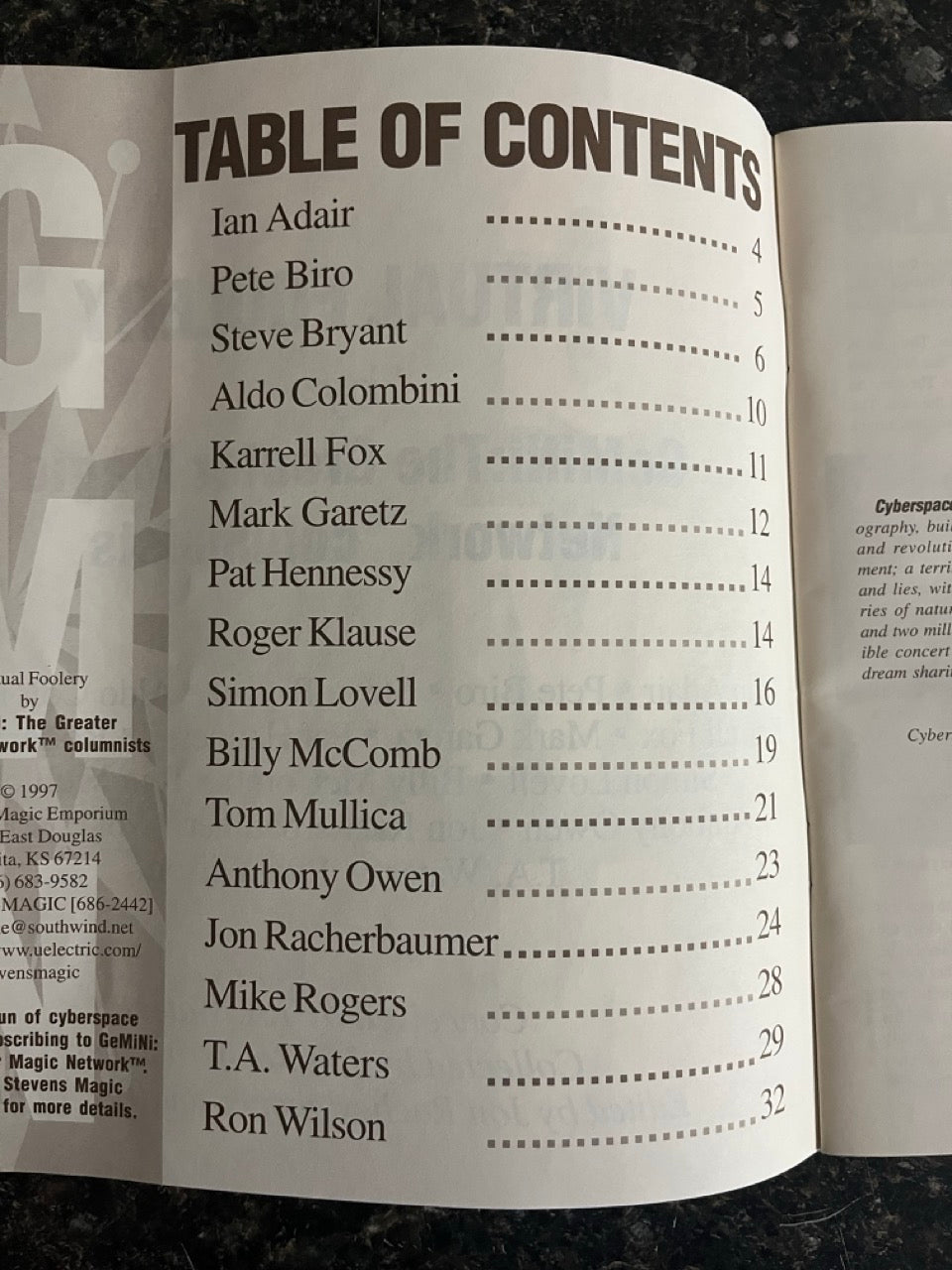 Articles and tricks, taken directly from the original GeMiNi Network columnists, including Pete Biro, Ian Adair, Steve Bryant, Aldo Colombini, Karrell Fox, Pat Hennessy, Mark Garetz, Roger Klause, Simon Lovell, Billy McComb, Tom Mullica, Anthony Owen, Jon Racherbaumer, Mike Rogers, T.A. Waters, Ron Wilson.