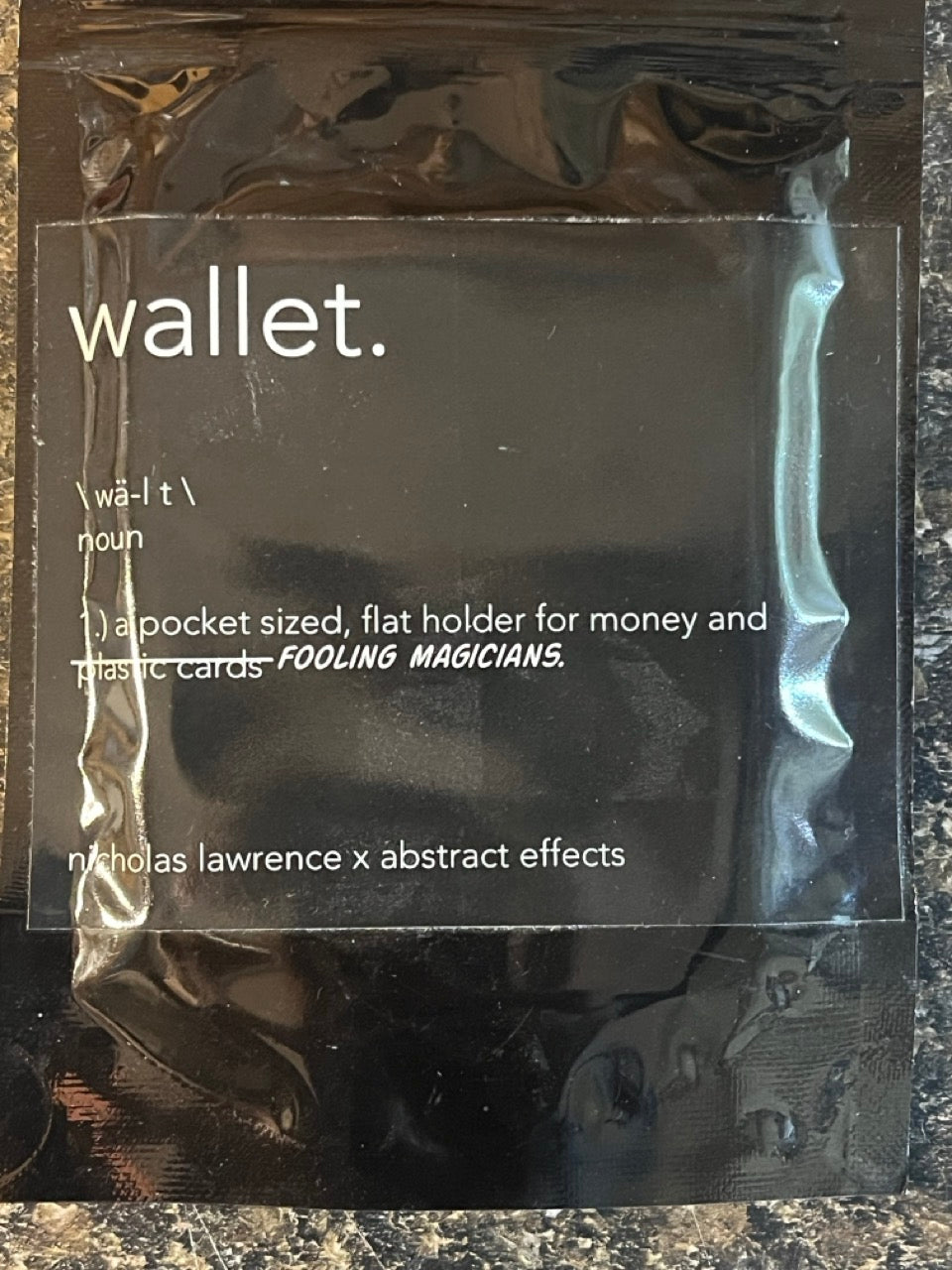 wallet. has a deceptive secret within the design, hidden in plain sight, allowing your spectators to examine the wallet throughout your routines!