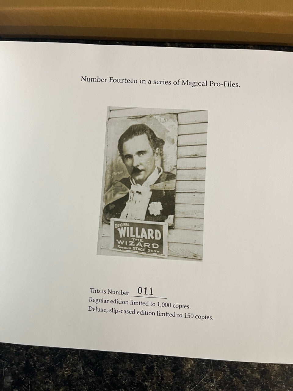 Deluxe, Slip-Cased Limited First Edition. Hardcover. Deluxe, slip-cased edition limited to 150 copies, this being number 11. Signed by David Charvet and Frances, Madeline, and Eugene Willard. 9" X 11 3/8". 370pp. Quarter-bound in bonded brown leather with light brown tent canvas cloth over boards, and upper board and spine lettered in bronze. Binding is firm and sound. Pages are clean and unmarked. Tipped in reproduced photograph of Harry Willard. Slipcase bound in same light brown tent canvas cloth, with Willard the Wizard seal in black and title in bronze to one side. A very nice signed and limited deluxe edition of this full presentation of the story of the men who performed under the name Willard the Wizard penned by magic designer David Charvet with help from Harry Willard's three children, fourteenth in Magic Words' series of Magical Pro-files, by Mike Caveney.