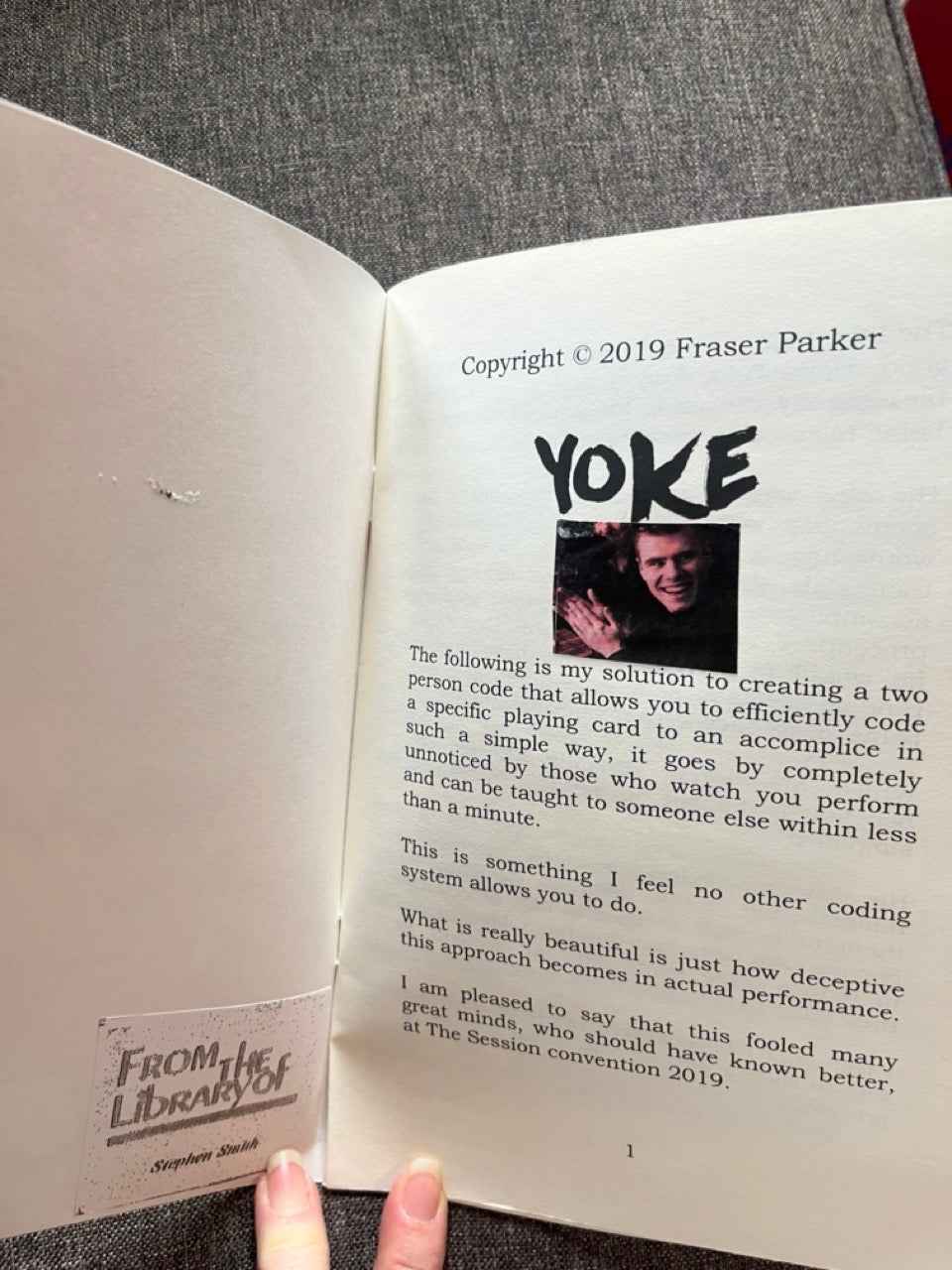 Yoke is the simplest and easiest to learn two-person code ever devised for sending a thought-of playing card to an accomplice.
