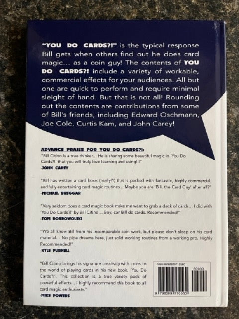 "YOU DO CARDS?!" is the typical response Bill gets when others find out he does card magic... as a coin guy! The contents of "YOU DO CARDS?!" include a variety of workable, commercial effects for your audiences. All but one are quick to perform and require minimal sleight of hand. But that is not all! Rounding out the contents are contributions from some of Bill's friends including Edward Oschmann, Joe Cole, Curtis Kam, and John Carey!